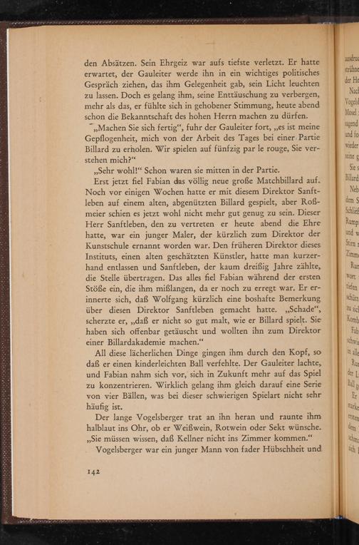 Erst jetzt fiel Fabian das völlig neue große Matchbillard auf. Noch vor einigen Wochen hatte er mit diesem Direktor Sanftleben auf einem alten, abgenützten Billard gespielt, aber Roẞßmeier schien es jetzt wohl nicht mehr gut genug zu sein. Dieser Herr Sanftleben, den zu vertreten heute abend die Ehre hatte, war ein junger Maler, der kürzlich zum Direktor der Kunstschule ernannt worden war. Den früheren Direktor dieses Instituts, einen alten geschätzten Künstler, hatte man kurzerhand entlassen und Sanftleben, der kaum dreißig Jahre zählte, die Stelle übertragen. Das alles fiel Fabian während der ersten Stöße ein, die ihm mißlangen, da er noch zu erregt war. Er erinnerte sich, daß Wolfgang kürzlich eine boshafte Bemerkung über diesen Direktor Sanftleben gemacht hatte. ,, Schade", scherzte er ,,, daß er nicht so gut malt, wie er Billard spielt. Sie haben sich offenbar getäuscht und wollten ihn zum Direktor einer Billardakademie machen."