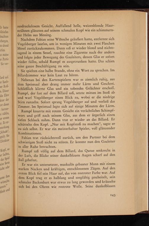 Nachdem Fabian seine Wünsche geäußert hatte, entfernte sich Vogelsberger lautlos, um in wenigen Minuten mit zwei Flaschen Mosel zurückzukommen. Dann saß er wieder blond und nichtssagend in einem Sessel, rauchte eine Zigarette nach der andern und folgte jeder Bewegung des Gauleiters, dessen Glas er sofort wieder füllte, sobald Rumpf es ausgetrunken hatte. Das schien seine ganze Beschäftigung zu sein.