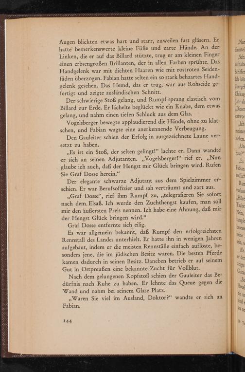 Augen blickten etwas hart und starr, zuweilen fast gläsern. Er hatte bemerkenswerte kleine Füße und zarte Hände. An der Linken, die er auf das Billard stützte, trug er am kleinen Finger einen erbsengroßen Brillanten, der in allen Farben sprühte. Das Handgelenk war mit dichten Haaren wie mit rostroten Seidenfäden überzogen. Fabian hatte selten ein so stark behaartes Handgelenk gesehen. Das Hemd, das er trug, war aus Rohseide gefertigt und zeigte ausländischen Schnitt.