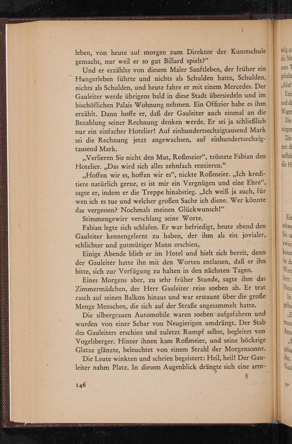 Und er erzählte von diesem Maler Sanftleben, der früher ein Hungerleben führte und nichts als Schulden hatte, Schulden, nichts als Schulden, und heute fahre er mit einem Mercedes . Der Gauleiter werde übrigens bald in diese Stadt übersiedeln und im bischöflichen Palais Wohnung nehmen. Ein Offizier habe es ihm erzählt. Dann hoffe er, daß der Gauleiter auch einmal an die Bezahlung seiner Rechnung denken werde. Er sei ja schließlich nur ein einfacher Hotelier! Auf einhundertsechzigtausend Mark sei die Rechnung jetzt angewachsen, auf einhundertsechzig- tausend Mark.