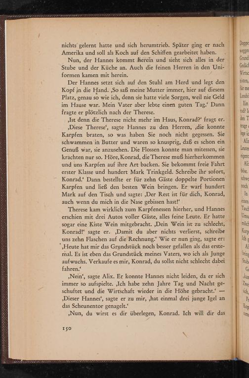 Therese kam wirklich zum Karpfenessen hierher, und Hannes erschien mit drei Autos voller Gäste, alles feine Leute. Er hatte sogar eine Kiste Wein mitgebracht., Dein Wein ist zu schlecht, Konrad! sagte er., Damit du aber nichts verlierst, schreibe uns zehn Flaschen auf die Rechnung. Wie er nun ging, sagte er: , Heute hat mir das Grundstück noch besser gefallen als das erstemal. Es ist eben das Grundstück meines Vaters, wo ich als Junge aufwuchs. Verkaufe es mir, Konrad, du sollst nicht schlecht dabei fahren."