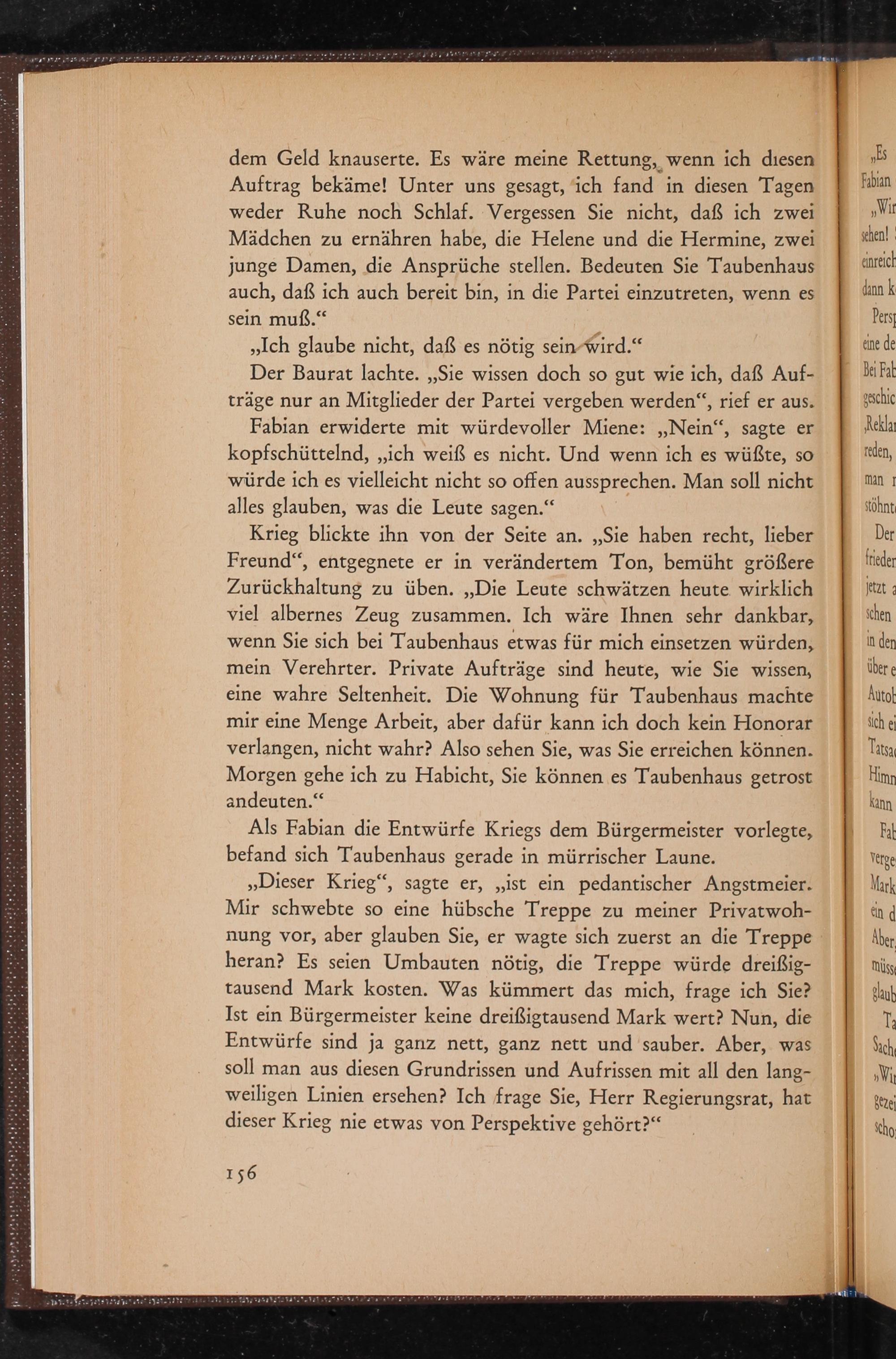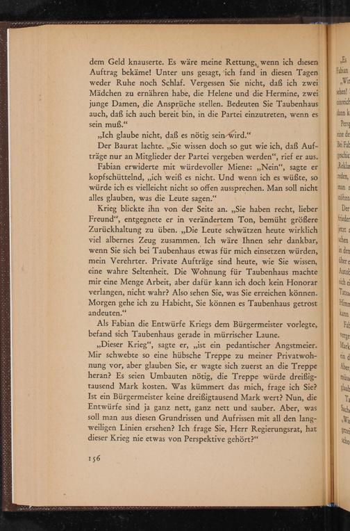 ,, Dieser Krieg", sagte er, ,, ist ein pedantischer Angstmeier. Mir schwebte so eine hübsche Treppe zu meiner Privatwohnung vor, aber glauben Sie, er wagte sich zuerst an die Treppe heran? Es seien Umbauten nötig, die Treppe würde dreißigtausend Mark kosten. Was kümmert das mich, frage ich Sie? Ist ein Bürgermeister keine dreißigtausend Mark wert? Nun, die Entwürfe sind ja ganz nett, ganz nett und sauber. Aber, was soll man aus diesen Grundrissen und Aufrissen mit all den langweiligen Linien ersehen? Ich frage Sie, Herr Regierungsrat, hat dieser Krieg nie etwas von Perspektive gehört?"