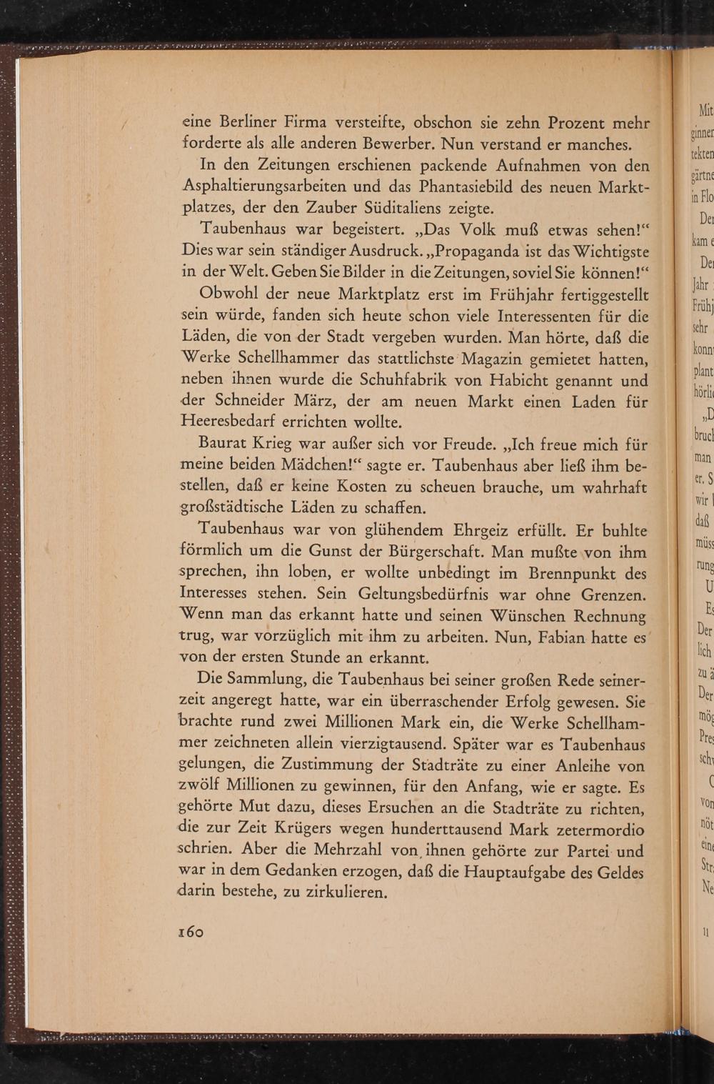 Taubenhaus war begeistert. ,, Das Volk muß etwas sehen!" Dies war sein ständiger Ausdruck. ,, Propaganda ist das Wichtigste in der Welt. Geben Sie Bilder in die Zeitungen, soviel Sie können!" Obwohl der neue Marktplatz erst im Frühjahr fertiggestellt sein würde, fanden sich heute schon viele Interessenten für die Läden, die von der Stadt vergeben wurden. Man hörte, daß die Werke Schellhammer das stattlichste Magazin gemietet hatten, neben ihnen wurde die Schuhfabrik von Habicht genannt und der Schneider März, der am neuen Markt einen Laden für Heeresbedarf errichten wollte.