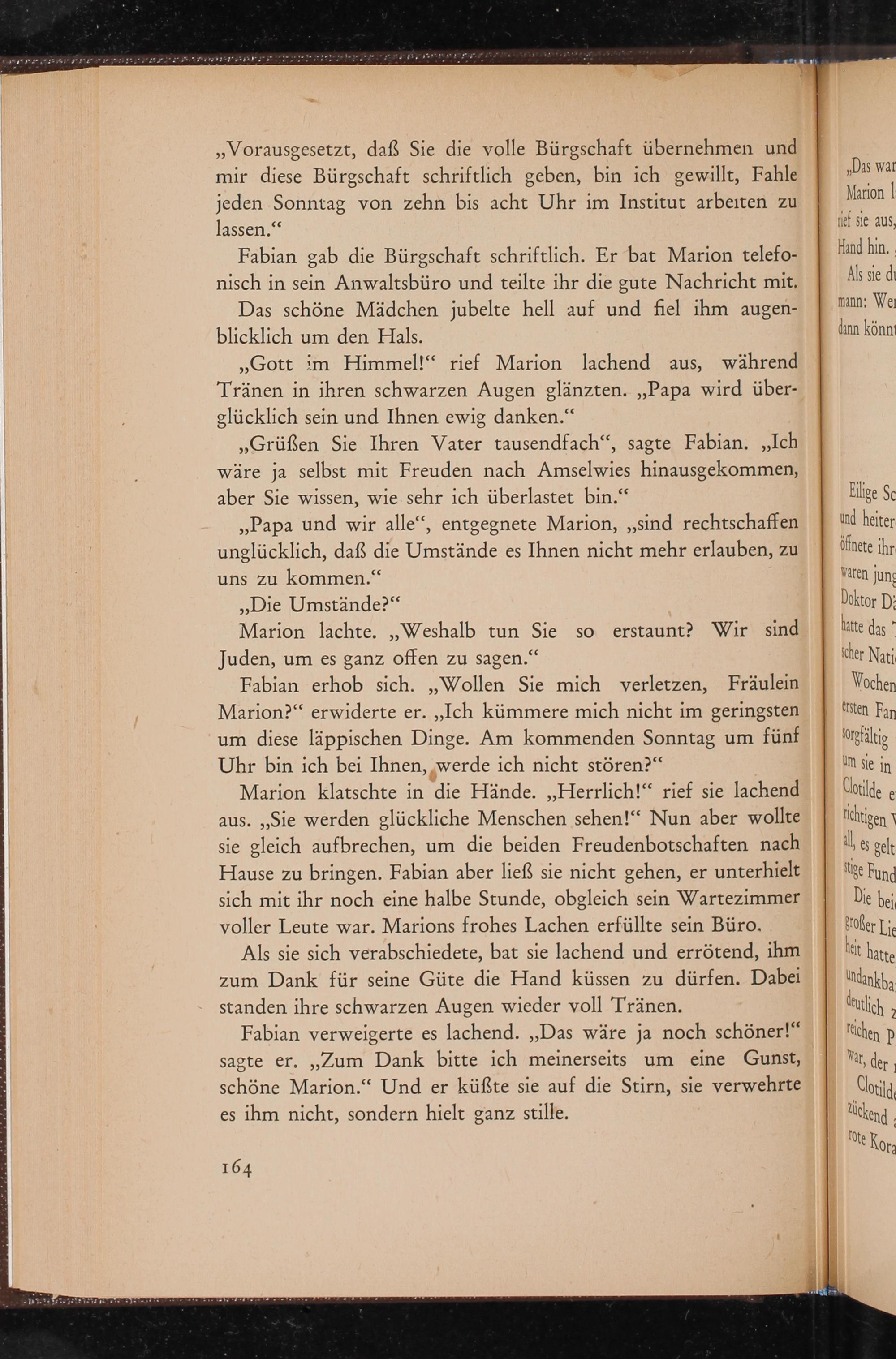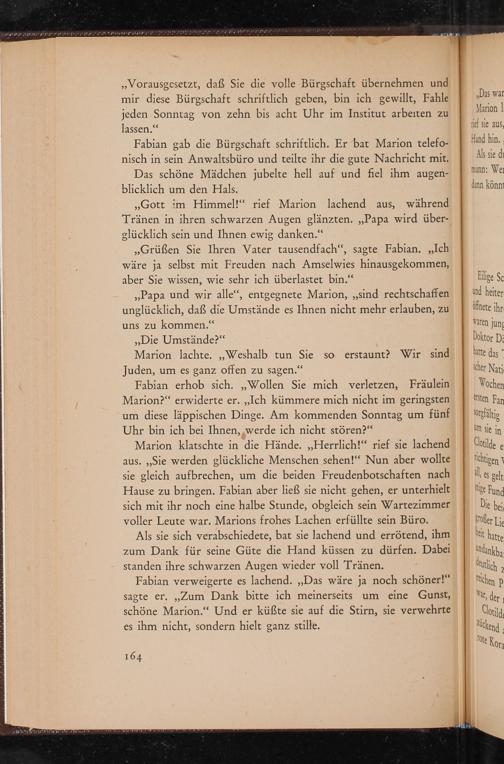 Fabian verweigerte es lachend. ,, Das wäre ja noch schöner!" sagte er. ,, Zum Dank bitte ich meinerseits um eine Gunst, schöne Marion." Und er küßte sie auf die Stirn, sie verwehrte es ihm nicht, sondern hielt ganz stille.
