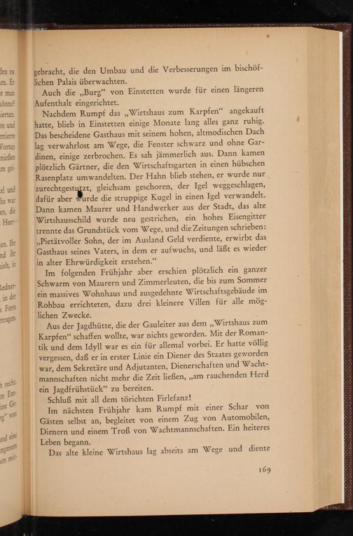 Aus der Jagdhütte, die der Gauleiter aus dem„, Wirtshaus zum Karpfen" schaffen wollte, war nichts geworden. Mit der Romantik und dem Idyll war es ein für allemal vorbei. Er hatte völlig vergessen, daß er in erster Linie ein Diener des Staates geworden war, dem Sekretäre und Adjutanten, Dienerschaften und Wachtmannschaften nicht mehr die Zeit ließen ,,, am rauchenden Herd ein Jagdfrühstück" zu bereiten.