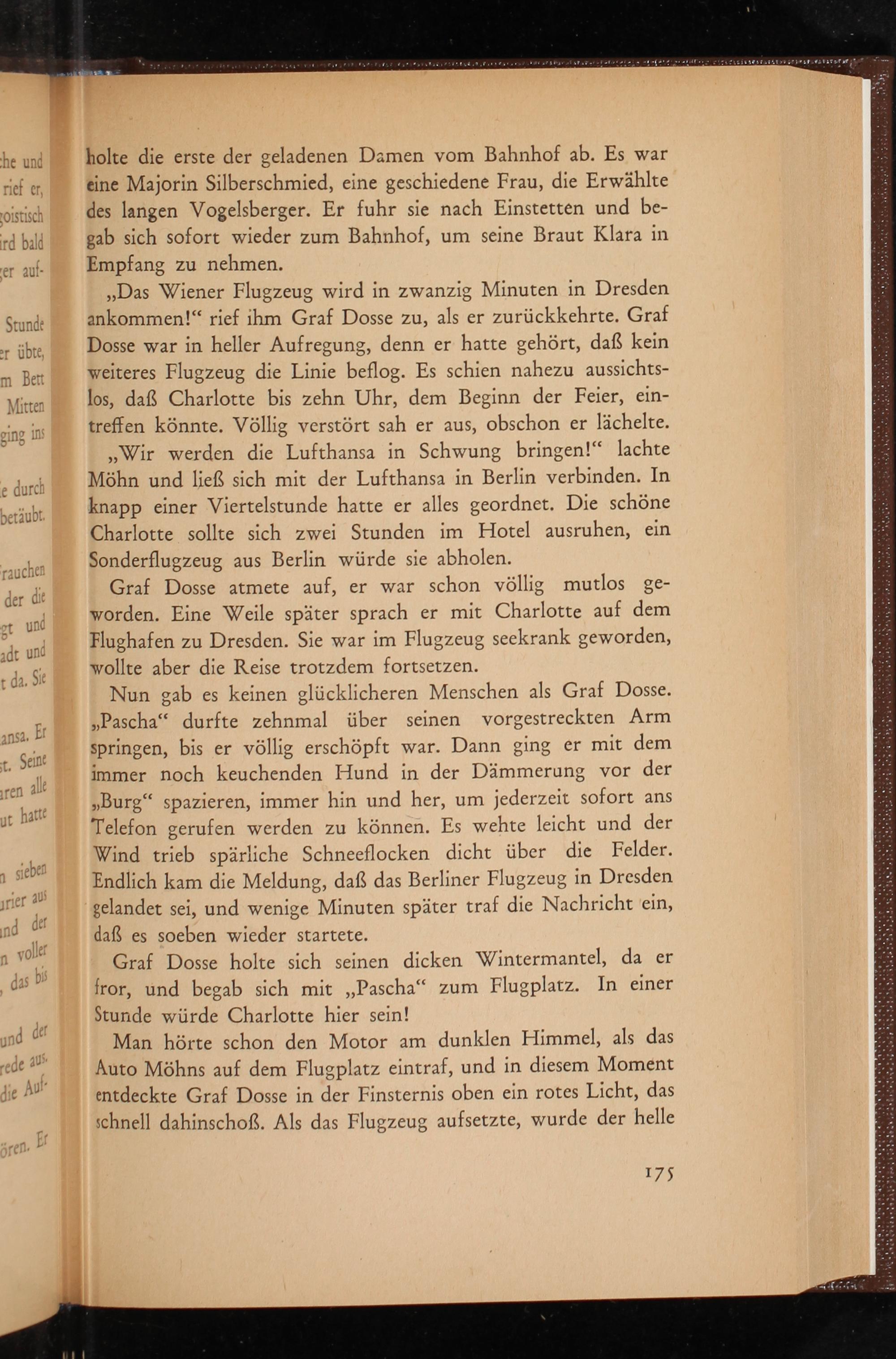 Graf Dosse atmete auf, er war schon völlig mutlos geworden. Eine Weile später sprach er mit Charlotte auf dem Flughafen zu Dresden . Sie war im Flugzeug seekrank geworden, wollte aber die Reise trotzdem fortsetzen.