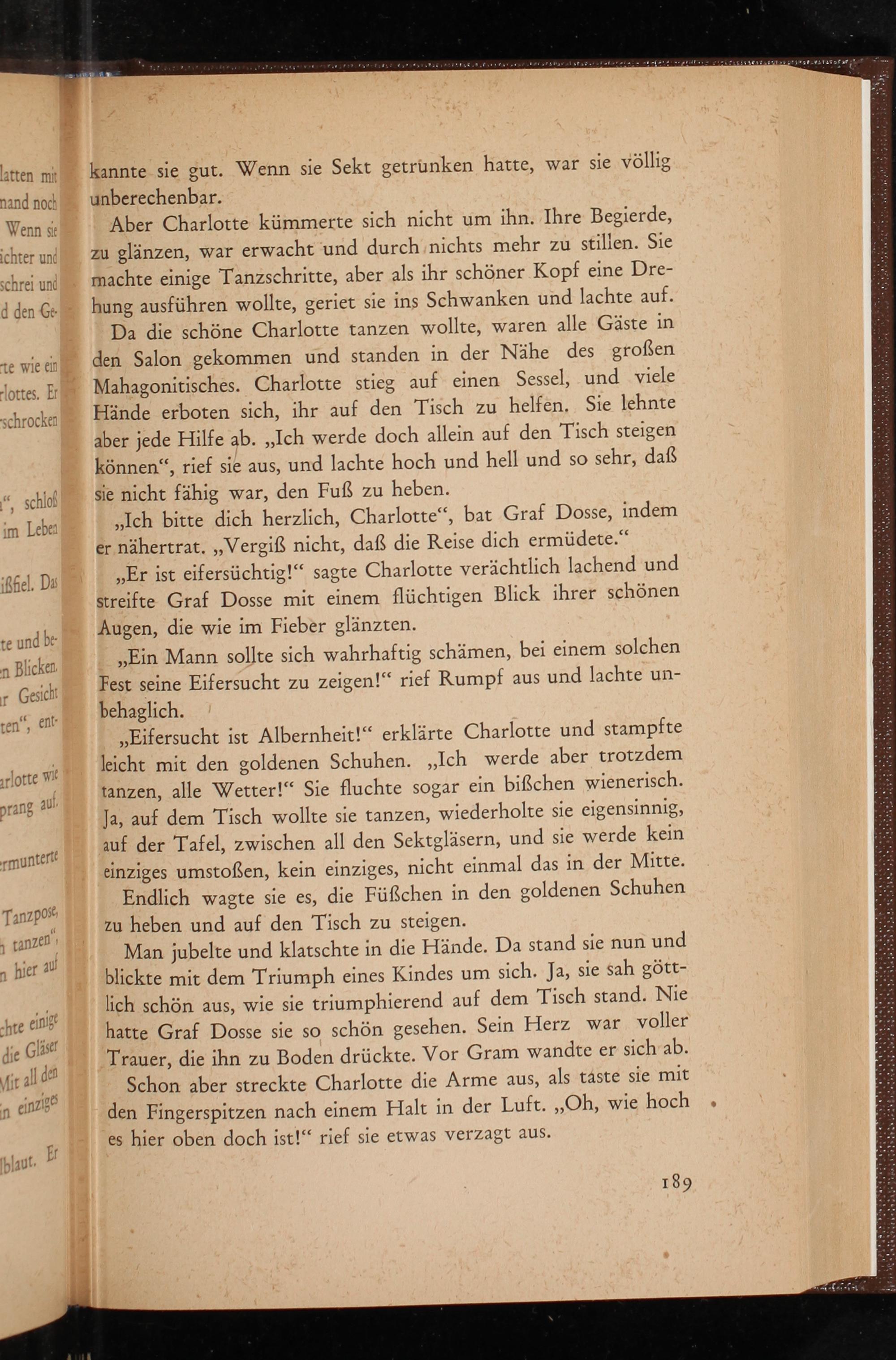 ,, Eifersucht ist Albernheit!" erklärte Charlotte und stampfte leicht mit den goldenen Schuhen. ,, Ich werde aber trotzdem tanzen, alle Wetter!" Sie fluchte sogar ein bißchen wienerisch. Ja, auf dem Tisch wollte sie tanzen, wiederholte sie eigensinnig, auf der Tafel, zwischen all den Sektgläsern, und sie werde kein einziges umstoẞen, kein einziges, nicht einmal das in der Mitte. Endlich wagte sie es, die Füßchen in den goldenen Schuhen zu heben und auf den Tisch zu steigen.
