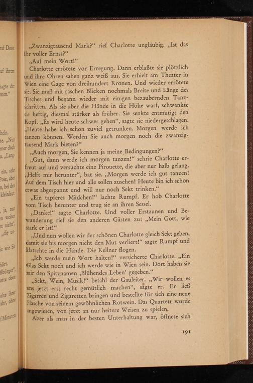 Charlotte errötete vor Erregung. Dann erblaßte sie plötzlich und ihre Ohren sahen ganz weiß aus. Sie erhielt am Theater in Wien eine Gage von dreihundert Kronen. Und wieder errötete sie. Sie maß mit raschen Blicken nochmals Breite und Länge des Tisches und begann wieder mit einigen bezaubernden Tanzschritten. Als sie aber die Hände in die Höhe warf, schwankte sie heftig, diesmal stärker als früher. Sie senkte entmutigt den Kopf. ,, Es wird heute schwer gehen", sagte sie niedergeschlagen. ,, Heute habe ich schon zuviel getrunken. Morgen werde ich tanzen können. Werden Sie auch morgen noch die zwanzigtausend Mark bieten?"