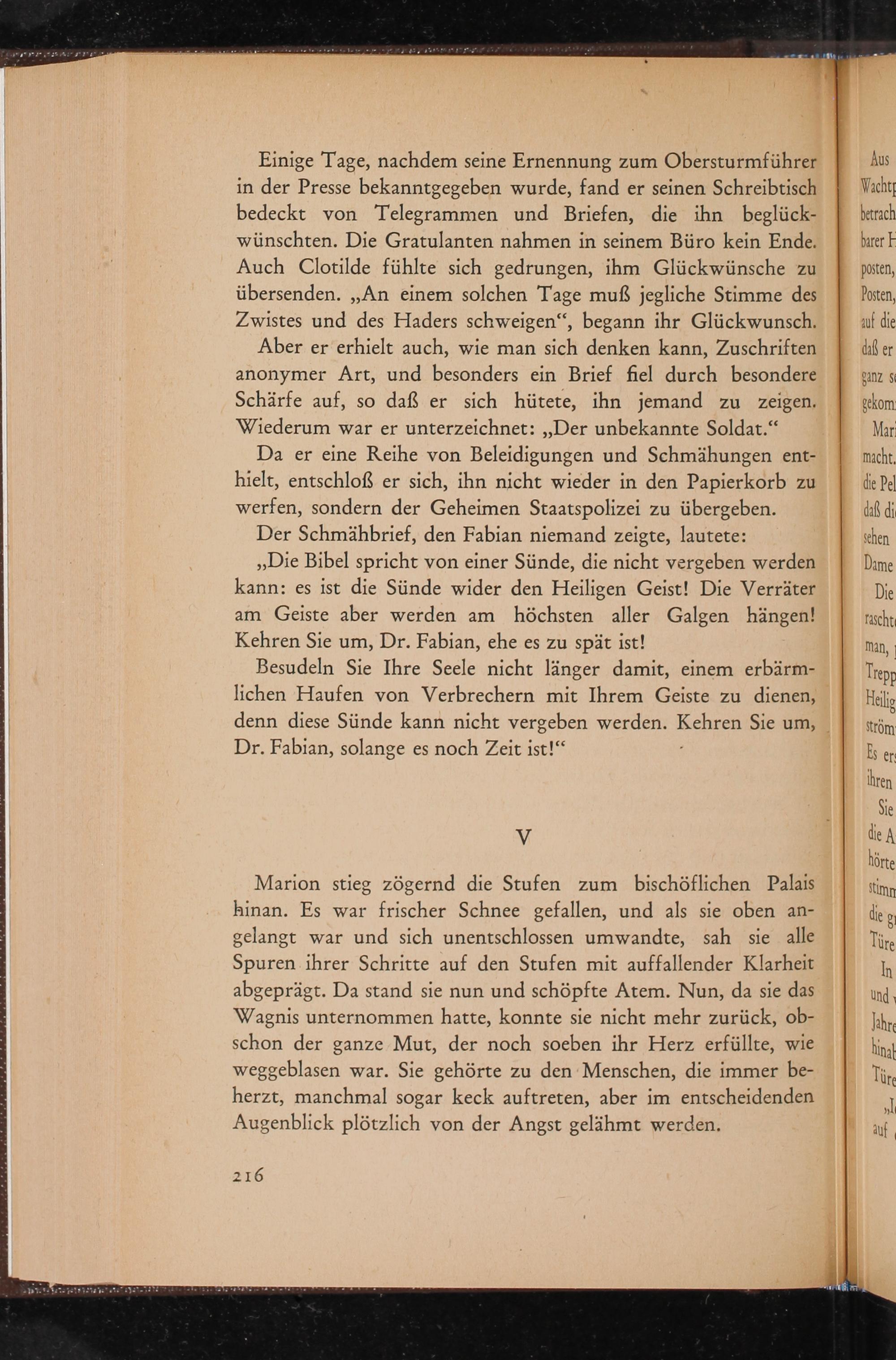 Der Schmähbrief, den Fabian niemand zeigte, lautete: ,, Die Bibel spricht von einer Sünde, die nicht vergeben werden kann: es ist die Sünde wider den Heiligen Geist! Die Verräter am Geiste aber werden am höchsten aller Galgen hängen! Kehren Sie um, Dr. Fabian, ehe es zu spät ist!