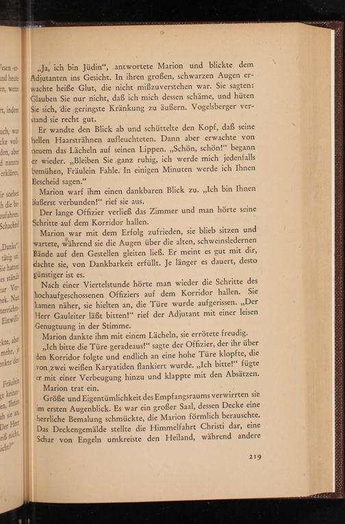 ,, Ja, ich bin Jüdin", antwortete Marion und blickte dem Adjutanten ins Gesicht. In ihren großen, schwarzen Augen erwachte heiße Glut, die nicht mißzuverstehen war. Sie sagten: Glauben Sie nur nicht, daß ich mich dessen schäme, und hüten Sie sich, die geringste Kränkung zu äußern. Vogelsberger verstand sie recht gut.