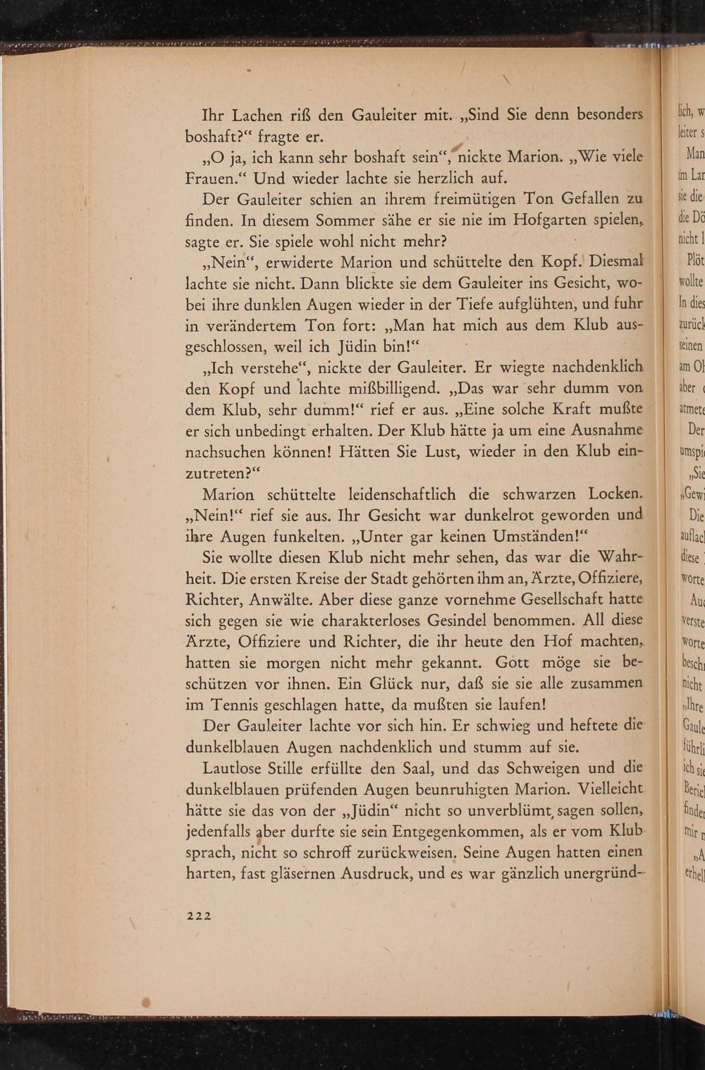 ,, Nein", erwiderte Marion und schüttelte den Kopf. Diesmal lachte sie nicht. Dann blickte sie dem Gauleiter ins Gesicht, wobei ihre dunklen Augen wieder in der Tiefe aufglühten, und fuhr in verändertem Ton fort:„ Man hat mich aus dem Klub ausgeschlossen, weil ich Jüdin bin!"