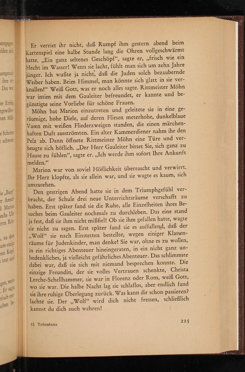 Möhn bat Marion einzutreten und geleitete sie in eine geräumige, hohe Diele, auf deren Fliesen meterhohe, dunkelblaue Vasen mit weißen Fliederzweigen standen, die einen märchenhaften Duft ausströmten. Ein alter Kammerdiener nahm ihr den Pelz ab. Dann öffnete. Rittmeister Möhn eine Türe und verbeugte sich höflich. ,, Der Herr Gauleiter bittet Sie, sich ganz zu Hause zu fühlen", sagte er. ,, Ich werde ihm sofort Ihre Ankunft melden."