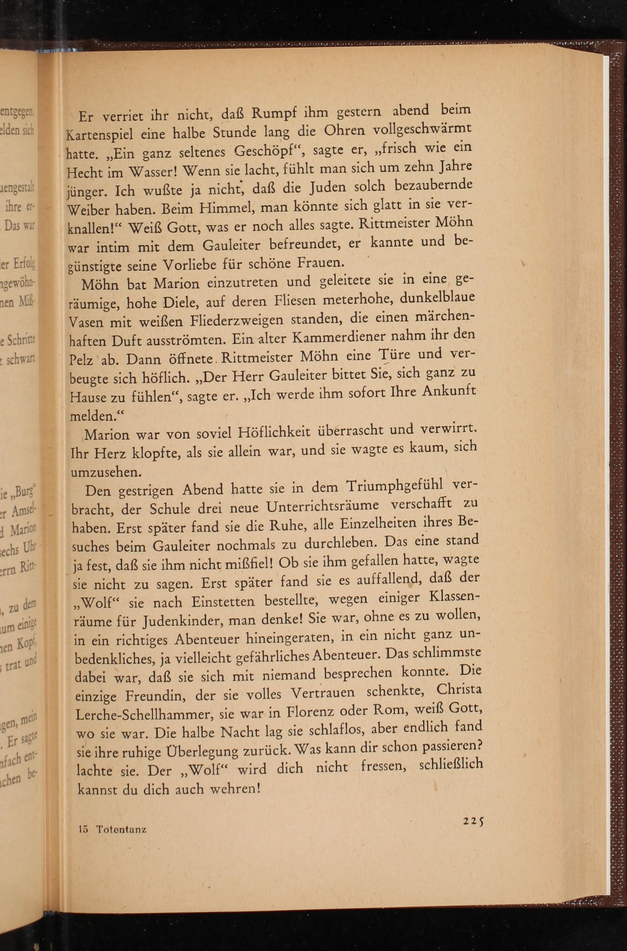 Den gestrigen Abend hatte sie in dem Triumphgefühl verbracht, der Schule drei neue Unterrichtsräume verschafft zu haben. Erst später fand sie die Ruhe, alle Einzelheiten ihres Besuches beim Gauleiter nochmals zu durchleben. Das eine stand ja fest, daß sie ihm nicht mißfiel! Ob sie ihm gefallen hatte, wagte sie nicht zu sagen. Erst später fand sie es auffallend, daß der ,, Wolf" sie nach Einstetten bestellte, wegen einiger Klassenräume für Judenkinder, man denke! Sie war, ohne es zu wollen, in ein richtiges Abenteuer hineingeraten, in ein nicht ganz unbedenkliches, ja vielleicht gefährliches Abenteuer. Das schlimmste dabei war, daß sie sich mit niemand besprechen konnte. Die einzige Freundin, der sie volles Vertrauen schenkte, Christa Lerche- Schellhammer, sie war in Florenz oder Rom, weiß Gott , wo sie war. Die halbe Nacht lag sie schlaflos, aber endlich fand sie ihre ruhige Überlegung zurück. Was kann dir schon passieren? lachte sie. Der ,, Wolf" wird dich nicht fressen, schließlich kannst du dich auch wehren!