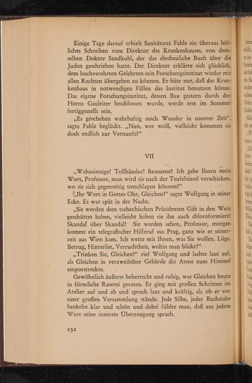 Einige Tage darauf erhielt Sanitätsrat Fahle ein überaus höfliches Schreiben vom Direktor des Krankenhauses, von demselben Doktor Sandkuhl, der das abscheuliche Buch über die Juden geschrieben hatte. Der Direktor erklärte sich glücklich, dem hochverehrten Gelehrten sein Forschungsinstitut wieder mit allen Rechten übergeben zu können. Er bäte nur, daß das Krankenhaus in notwendigen Fällen das Institut benutzen könne. Das eigene Forschungsinstitut, dessen Bau gestern durch den Herrn Gauleiter beschlossen wurde, werde erst im Sommer fertiggestellt sein.