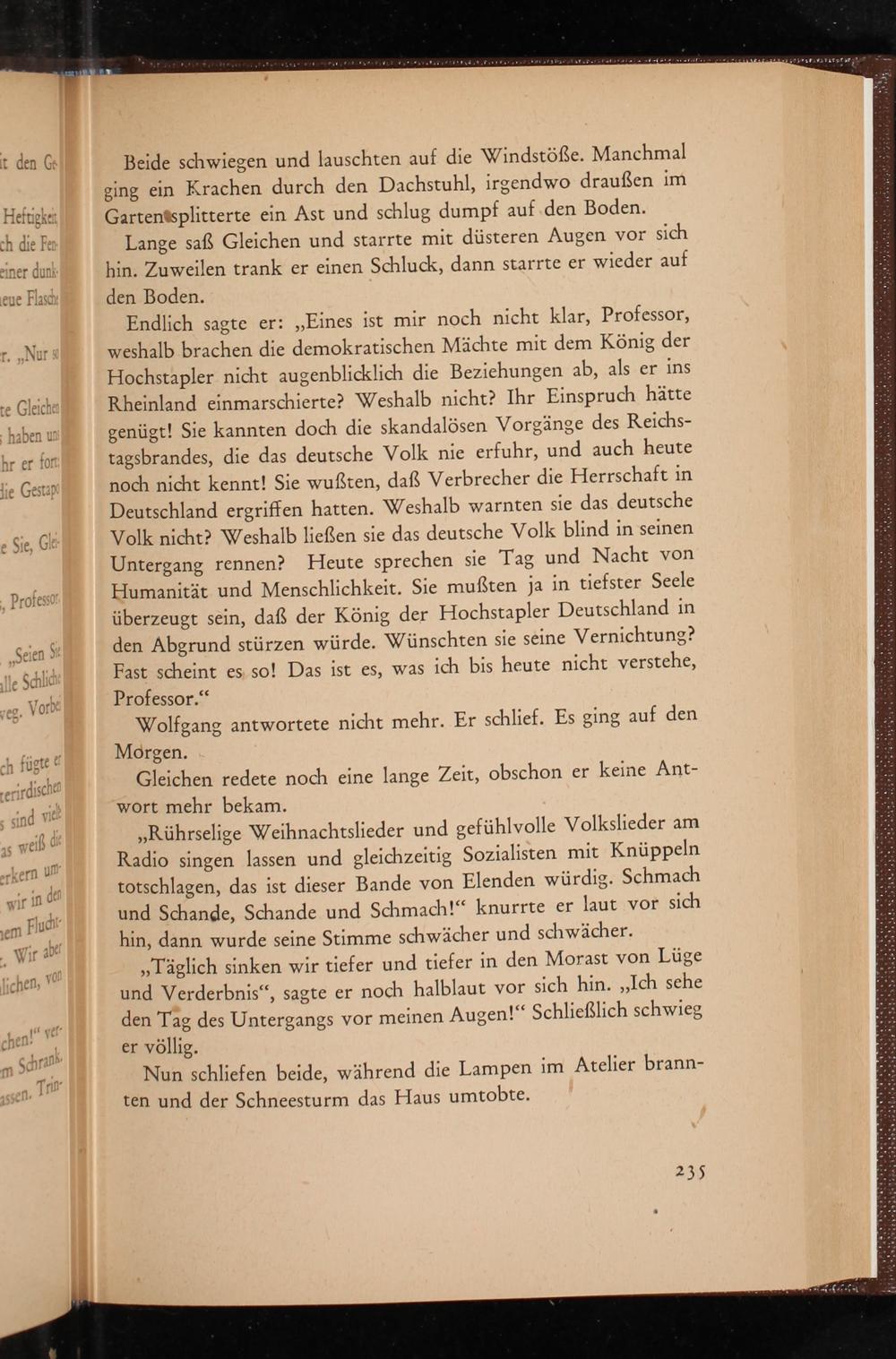 Endlich sagte er:„Eines ist mir noch nicht klar, Professor, weshalb brachen die demokratischen Mächte mit dem König der Hochstapler nicht augenblicklich die Beziehungen ab, als er ins Rheinland einmarschierte? Weshalb nicht? Ihr Einspruch hätte genügt! Sie kannten doch die skandalösen Vorgänge des Reichs- tagsbrandes, die das deutsche Volk nie erfuhr, und auch heute noch nicht kennt! Sie wußten, daß Verbrecher die Herrschaft in Deutschland ergriffen hatten. Weshalb warnten sie das deutsche Volk nicht? Weshalb ließen sie das deutsche Volk blind in seinen Untergang rennen? Heute sprechen sie Tag und Nacht von Humanität und Menschlichkeit. Sie mußten ja in tiefster Seele überzeugt sein, daß der König der Hochstapler Deutschland in den Abgrund stürzen würde. Wünschten sie seine Vernichtung? Fast scheint es, so! Das ist es, was ich bis heute nicht verstehe, Professor.“