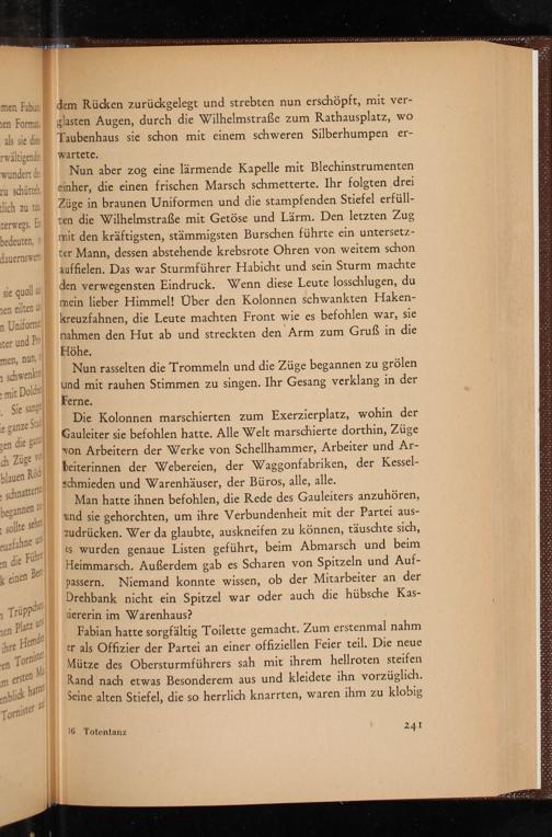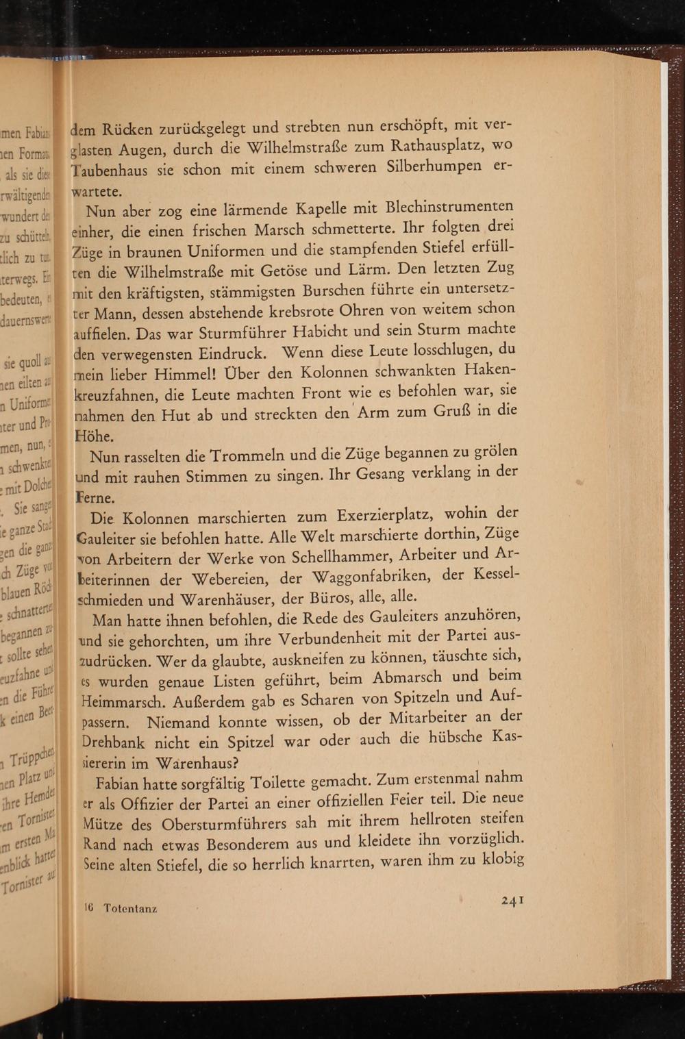 Fabian hatte sorgfältig Toilette gemacht. Zum erstenmal nahm er als Offizier der Partei an einer offiziellen Feier teil. Die neue Mütze des Obersturmführers sah mit ihrem hellroten steifen Rand nach etwas Besonderem aus und kleidete ihn vorzüglich. Seine alten Stiefel, die so herrlich knarrten, waren ihm zu klobig