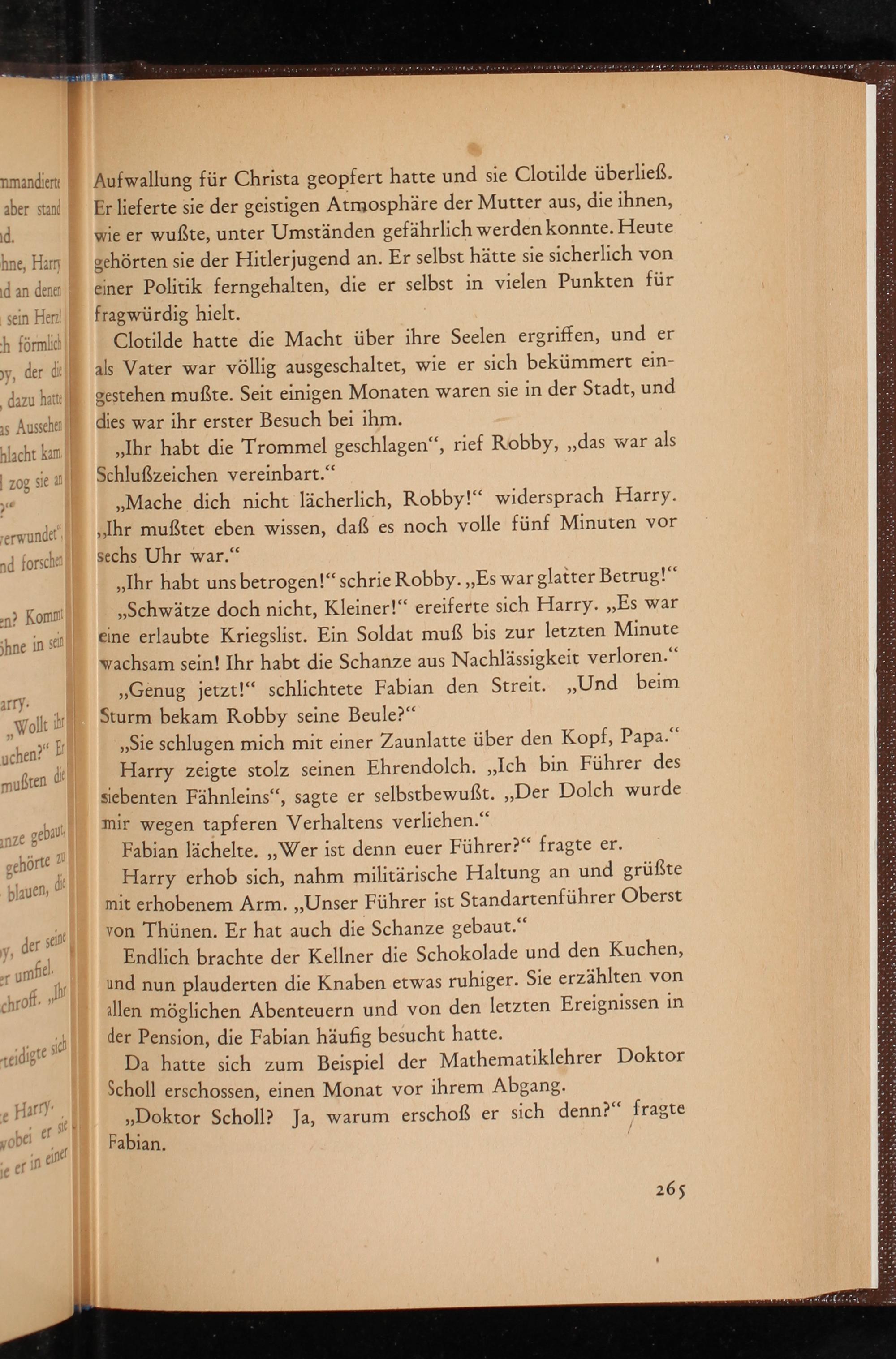 ,, Sie schlugen mich mit einer Zaunlatte über den Kopf, Papa." Harry zeigte stolz seinen Ehrendolch. ,, Ich bin Führer des siebenten Fähnleins", sagte er selbstbewußt. ,, Der Dolch wurde mir wegen tapferen Verhaltens verliehen.“