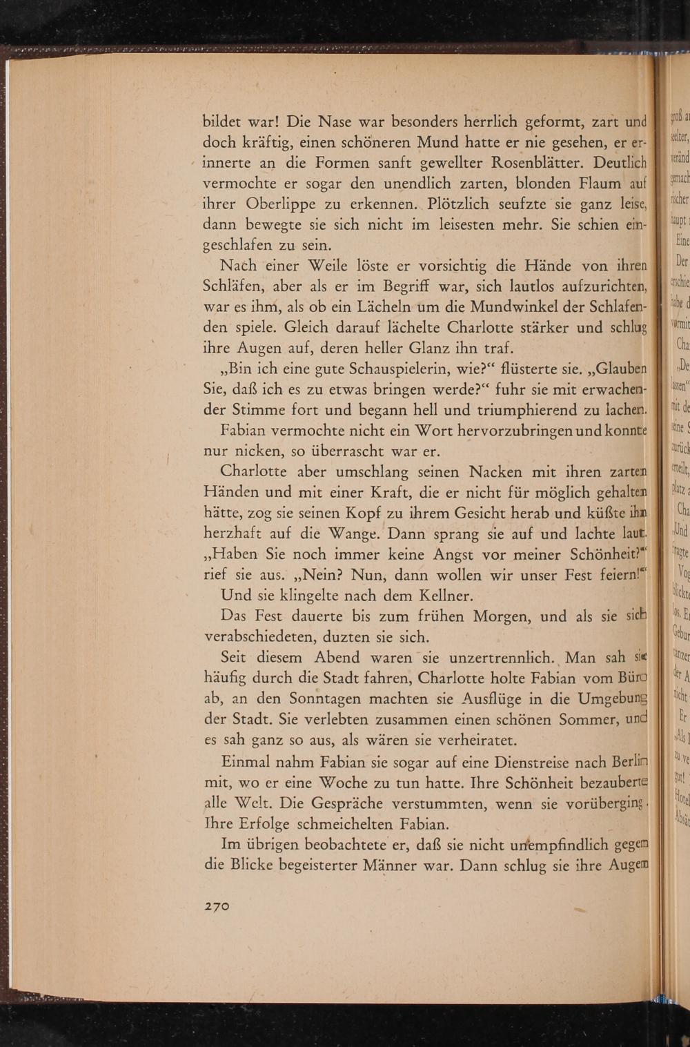 Einmal nahm Fabian sie sogar auf eine Dienstreise nach Berlin mit, wo er eine Woche zu tun hatte. Ihre Schönheit bezauberte alle Welt. Die Gespräche verstummten, wenn sie vorüberging: Ihre Erfolge schmeichelten Fabian.