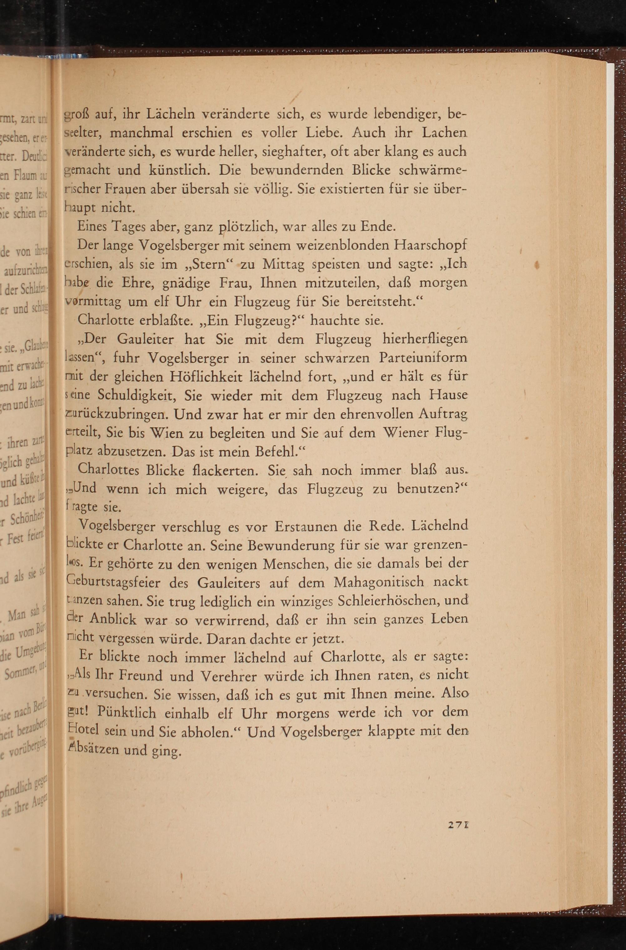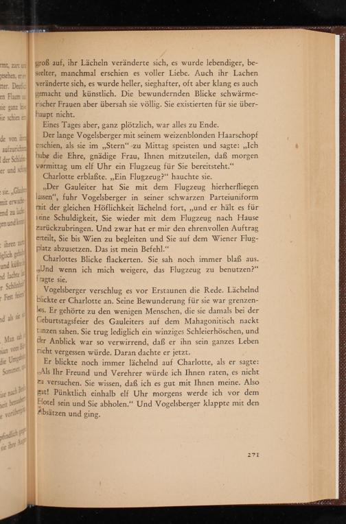 ,, Der Gauleiter hat Sie mit dem Flugzeug hierherfliegen lassen", fuhr Vogelsberger in seiner schwarzen Parteiuniform mit der gleichen Höflichkeit lächelnd fort ,,, und er hält es für seine Schuldigkeit, Sie wieder mit dem Flugzeug nach Hause zurückzubringen. Und zwar hat er mir den ehrenvollen Auftrag erteilt, Sie bis Wien zu begleiten und Sie auf dem Wiener Flugplatz abzusetzen. Das ist mein Befehl."
