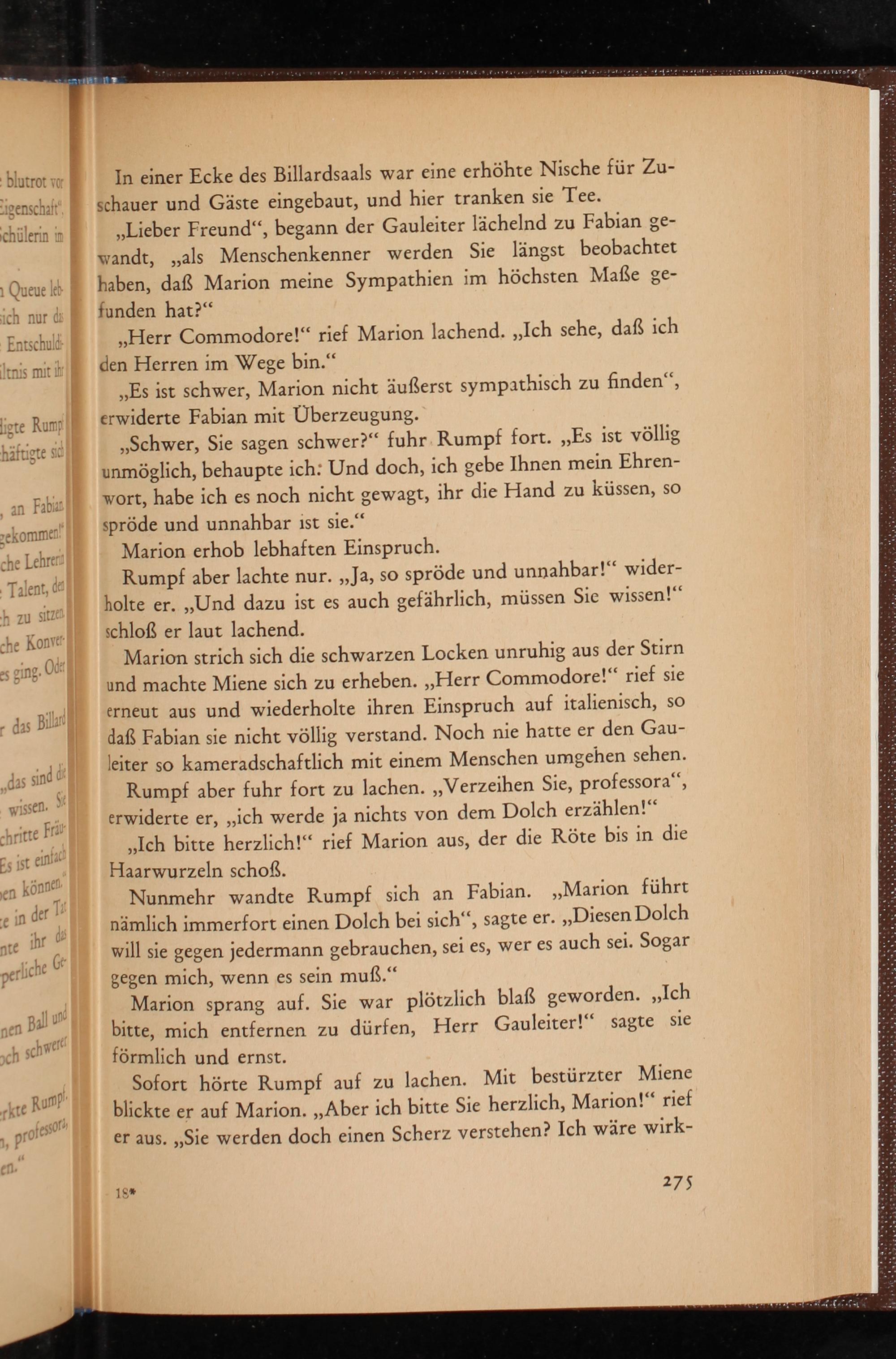 Marion strich sich die schwarzen Locken unruhig aus der Stirn und machte Miene sich zu erheben.„Herr Commodore!“ rief sie erneut aus und wiederholte ihren Einspruch auf italienisch, so daß Fabian sie nicht völlig verstand. Noch nie hatte er den Gau- leiter so kameradschaftlich mit einem Menschen umgehen sehen.