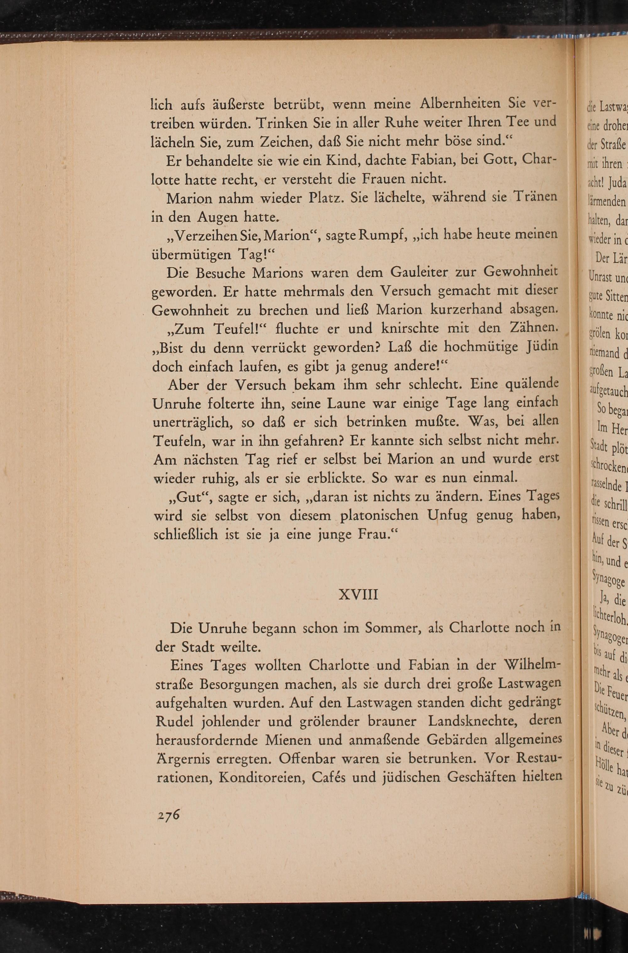 Eines Tages wollten Charlotte und Fabian in der Wilhelmstraße Besorgungen machen, als sie durch drei große Lastwagen aufgehalten wurden. Auf den Lastwagen standen dicht gedrängt Rudel johlender und grölender brauner Landsknechte, deren herausfordernde Mienen und anmaßende Gebärden allgemeines Ärgernis erregten. Offenbar waren sie betrunken. Vor Restaurationen, Konditoreien, Cafés und jüdischen Geschäften hielten