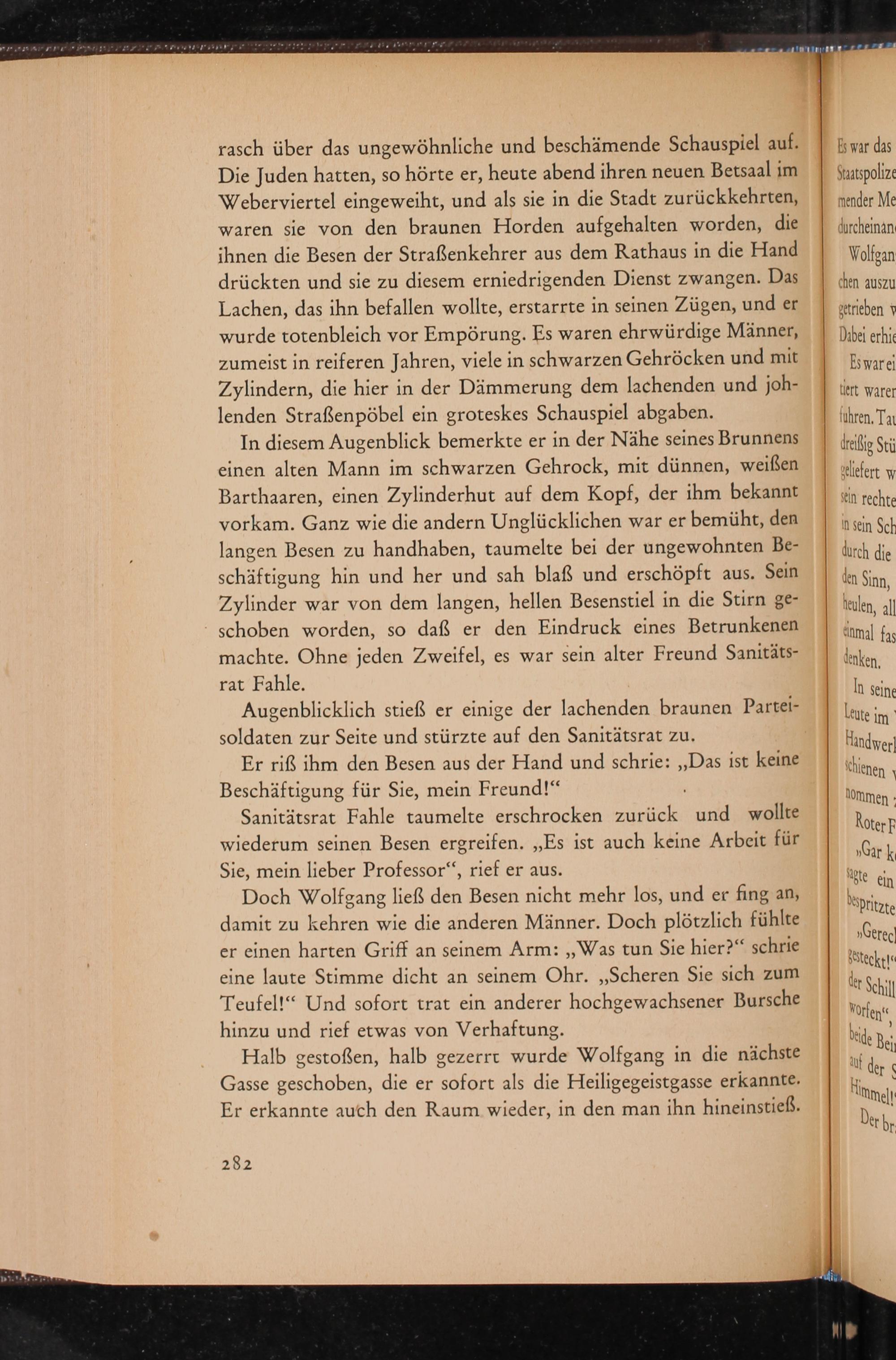 rasch über das ungewöhnliche und beschämende Schauspiel auf. Die Juden hatten, so hörte er, heute abend ihren neuen Betsaal im Weberviertel eingeweiht, und als sie in die Stadt zurückkehrten, waren sie von den braunen Horden aufgehalten worden, die ihnen die Besen der Straßenkehrer aus dem Rathaus in die Hand drückten und sie zu diesem erniedrigenden Dienst zwangen. Das Lachen, das ihn befallen wollte, erstarrte in seinen Zügen, und er wurde totenbleich vor Empörung. Es waren ehrwürdige Männer, zumeist in reiferen Jahren, viele in schwarzen Gehröcken und mit Zylindern, die hier in der Dämmerung dem lachenden und johlenden Straßenpöbel ein groteskes Schauspiel abgaben.