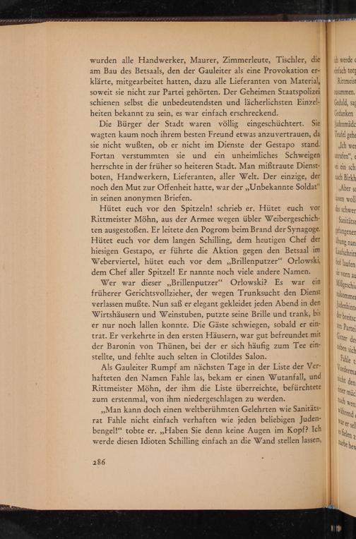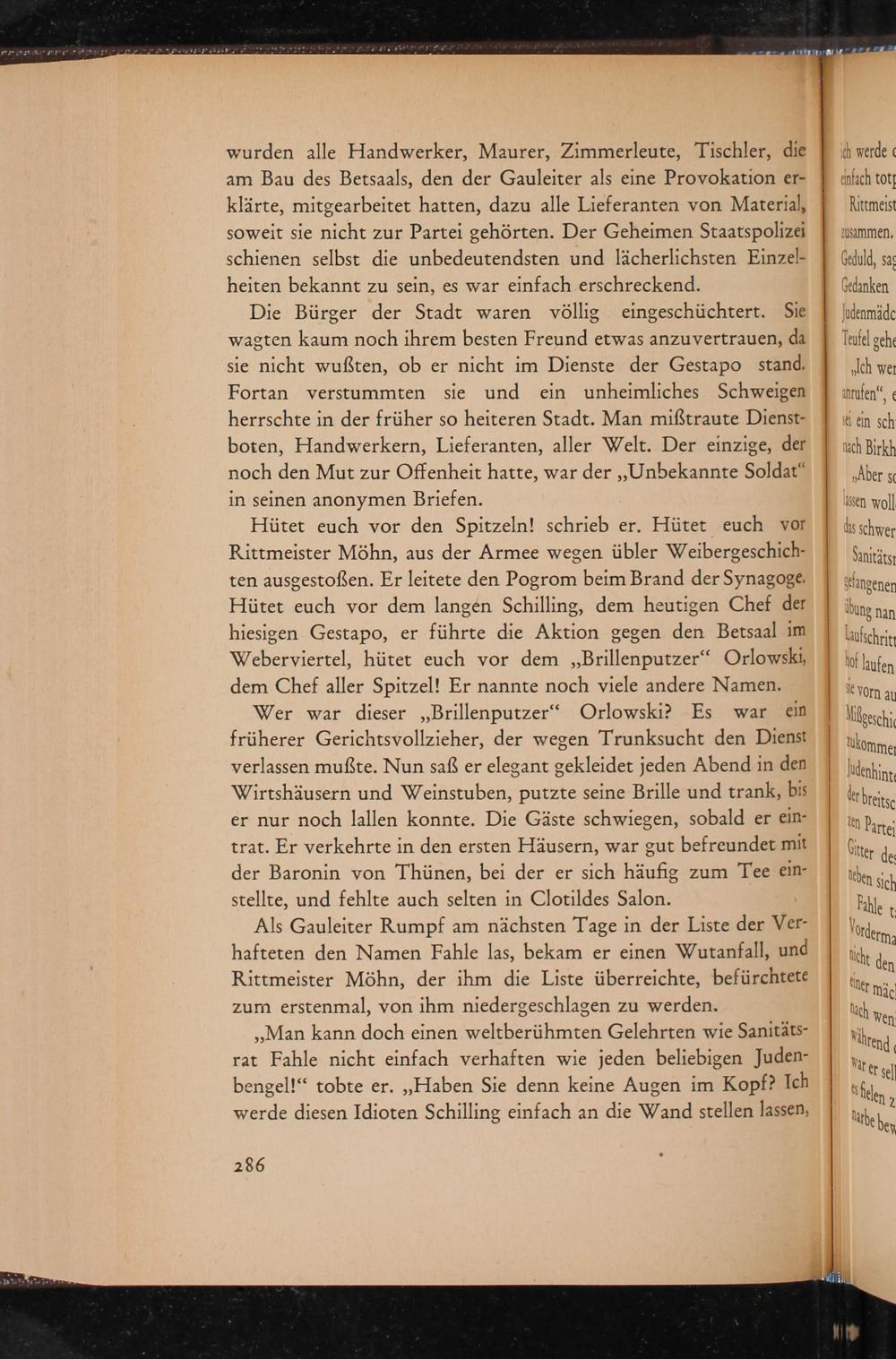 Hütet euch vor den Spitzeln! schrieb er. Hütet euch vor Rittmeister Möhn, aus der Armee wegen übler Weibergeschichten ausgestoßen. Er leitete den Pogrom beim Brand der Synagoge. Hütet euch vor dem langen Schilling, dem heutigen Chef der hiesigen Gestapo , er führte die Aktion gegen den Betsaal im Weberviertel, hütet euch vor dem ,, Brillenputzer" Orlowski, dem Chef aller Spitzel! Er nannte noch viele andere Namen.