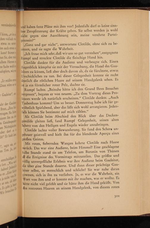 Clotilde dankte für die Audienz und verbeugte sich. Einen Augenblick kämpfte sie mit der Versuchung, die Hand des Gauleiters zu küssen, ließ aber doch davon ab, da sie fürchtete, etwas Unschickliches zu tun. Bei dieser Gelegenheit konnte sie recht deutlich die rötlichen Haare auf seinem Handgelenk sehen. Es ist ja ein förmlicher roter Pelz, dachte sie.
