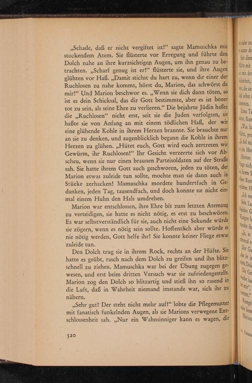 ,, Schade, daß er nicht vergiftet ist!" sagte Mamuschka mit stockendem Atem. Sie flüsterte vor Erregung und führte den Dolch nahe an ihre kurzsichtigen Augen, um ihn genau zu betrachten. ,, Scharf genug ist er!" flüsterte sie, und ihre Augen glühten vor Haß. ,, Damit stichst du hart zu, wenn dir einer der Ruchlosen zu nahe kommt, hörst du, Marion, das schwörst du mir!" Und Marion beschwor es. ,, Wenn sie dich dann töten, so ist es dein Schicksal, das dir Gott bestimmte, aber es ist besser tot zu sein, als seine Ehre zu verlieren." Die bejahrte Jüdin haẞte die ,, Ruchlosen" nicht erst, seit sie die Juden verfolgten, sie haßte sie von Anfang an mit einem tödlichen Haß, der wie eine glühende Kohle in ihrem Herzen brannte. Sie brauchte nur an sie zu denken, und augenblicklich begann die Kohle in ihrem Herzen zu glühen. ,, Hütet euch, Gott wird euch zertreten wie Gewürm, ihr Ruchlosen!" Ihr Gesicht verzerrte sich vor Abscheu, wenn sie nur einen braunen Parteisoldaten auf der Straße sah. Sie hatte ihrem Gott auch geschworen, jeden zu töten, der Marion etwas zuleide tun sollte, mochte man sie dann auch in Stücke zerhacken! Mamuschka mordete hundertfach in Gedanken, jeden Tag, tausendfach, und doch konnte sie nicht einmal einem Huhn den Hals umdrehen.