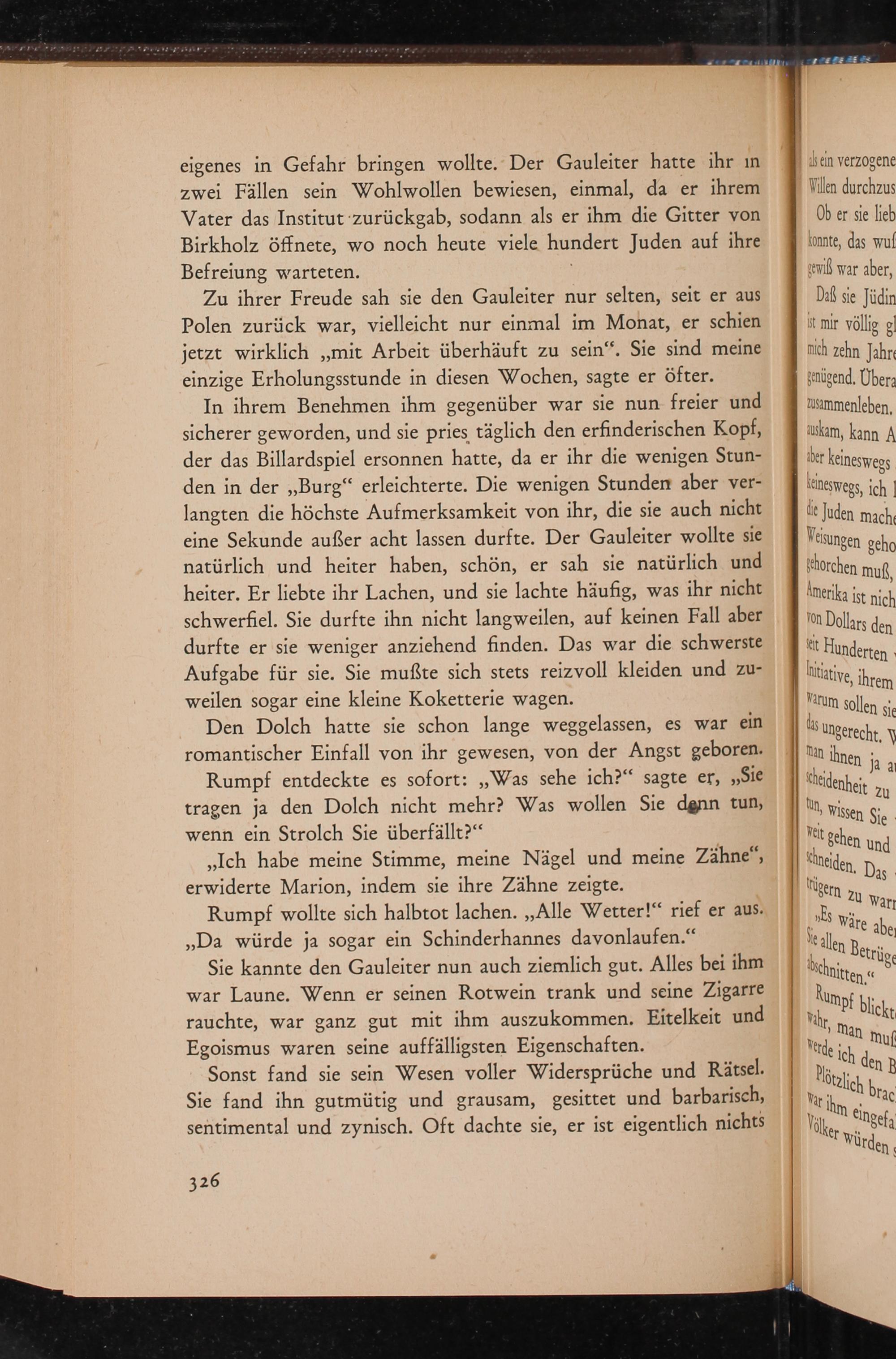 eigenes in Gefahr bringen wollte. Der Gauleiter hatte ihr in zwei Fällen sein Wohlwollen bewiesen, einmal, da er ihrem Vater das Institut zurückgab, sodann als er ihm die Gitter von Birkholz öffnete, wo noch heute viele hundert Juden auf ihre Befreiung warteten.
