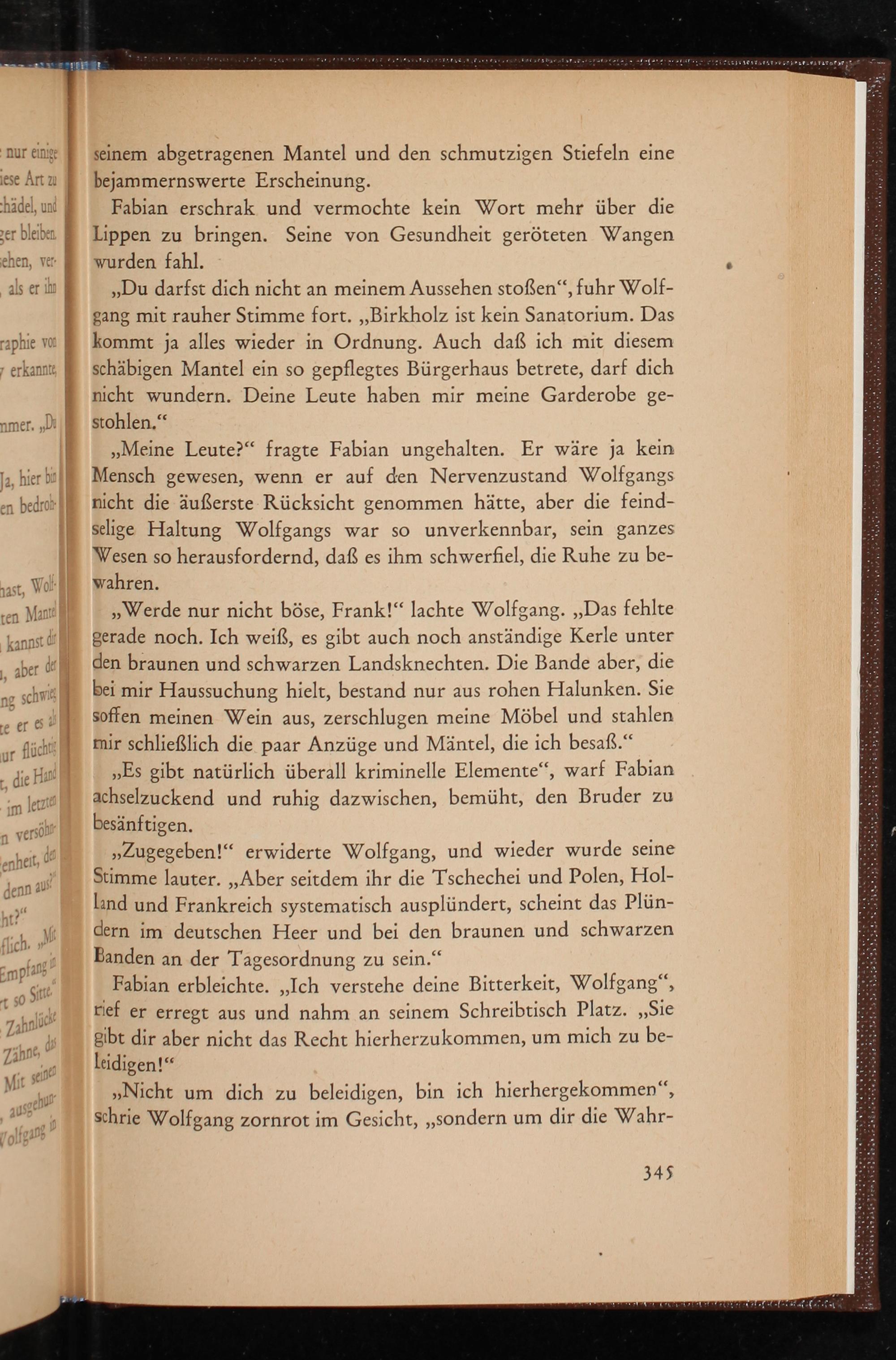 ,, Du darfst dich nicht an meinem Aussehen stoßen", fuhr Wolfgang mit rauher Stimme fort. ,, Birkholz ist kein Sanatorium. Das kommt ja alles wieder in Ordnung. Auch daß ich mit diesem schäbigen Mantel ein so gepflegtes Bürgerhaus betrete, darf dich nicht wundern. Deine Leute haben mir meine Garderobe gestohlen."