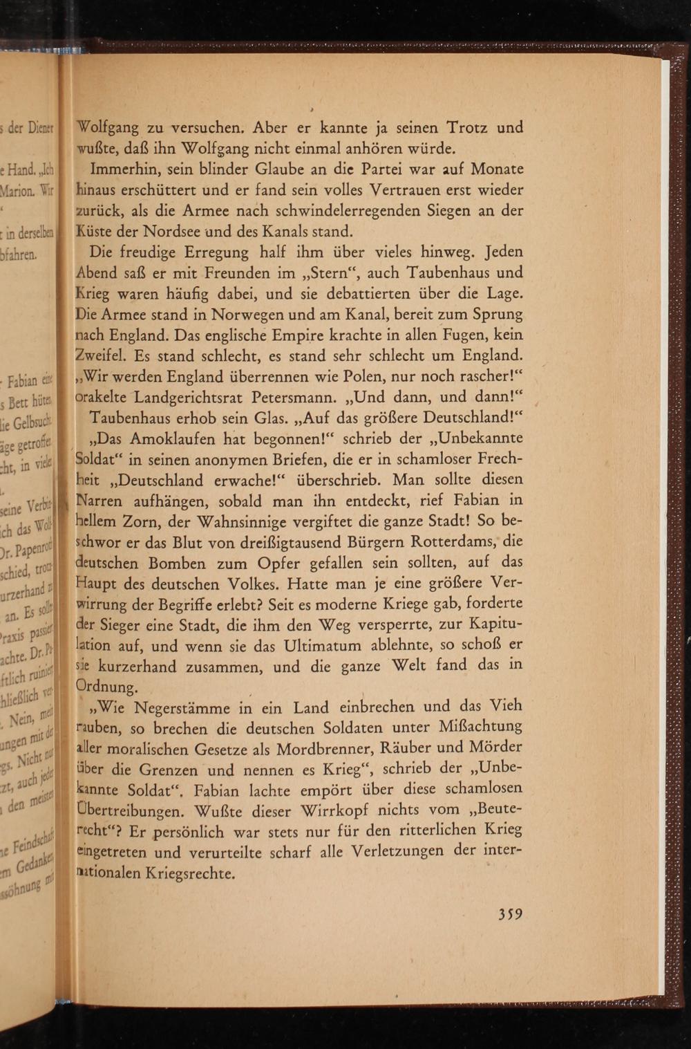 Die freudige Erregung half ihm über vieles hinweg. Jeden Abend saß er mit Freunden im ,, Stern", auch Taubenhaus und Krieg waren häufig dabei, und sie debattierten über die Lage. Die Armee stand in Norwegen und am Kanal, bereit zum Sprung nach England. Das englische Empire krachte in allen Fugen, kein Zweifel. Es stand schlecht, es stand sehr schlecht um England. ,, Wir werden England überrennen wie Polen , nur noch rascher!" orakelte Landgerichtsrat Petersmann. ,, Und dann, und dann!"