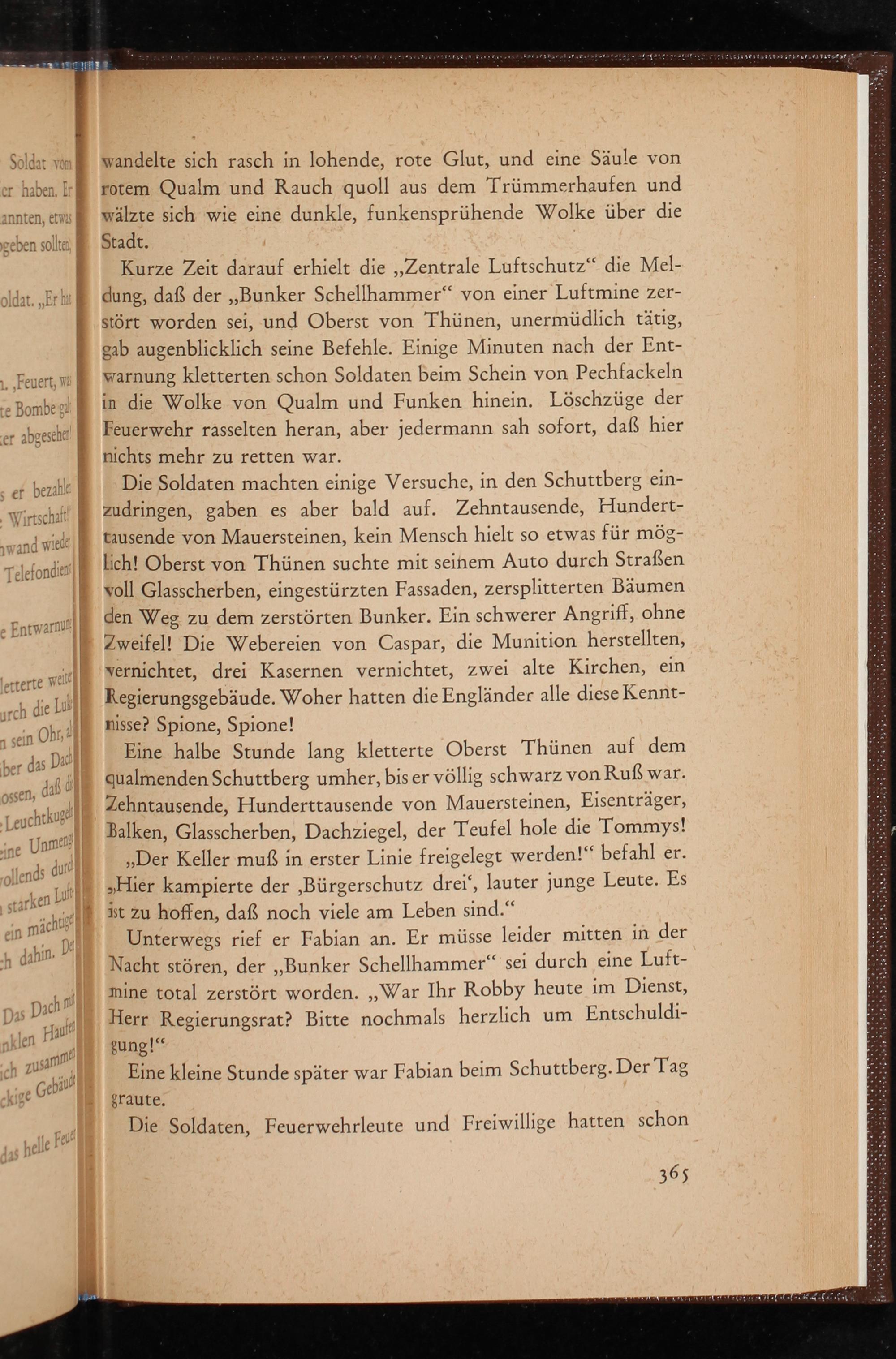 Die Soldaten machten einige Versuche, in den Schuttberg einzudringen, gaben es aber bald auf. Zehntausende, Hunderttausende von Mauersteinen, kein Mensch hielt so etwas für mögLich! Oberst von Thünen suchte mit seinem Auto durch Straßen voll Glasscherben, eingestürzten Fassaden, zersplitterten Bäumen den Weg zu dem zerstörten Bunker. Ein schwerer Angriff, ohne Zweifel! Die Webereien von Caspar, die Munition herstellten, vernichtet, drei Kasernen vernichtet, zwei alte Kirchen, ein Regierungsgebäude. Woher hatten die Engländer alle diese Kenntnisse? Spione, Spione!