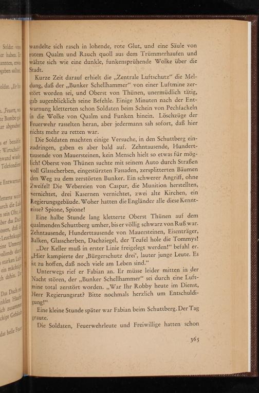 Kurze Zeit darauf erhielt die ,, Zentrale Luftschutz " die Meldung, daß der ,, Bunker Schellhammer" von einer Luftmine zerstört worden sei, und Oberst von Thünen, unermüdlich tätig, gab augenblicklich seine Befehle. Einige Minuten nach der Entwarnung kletterten schon Soldaten beim Schein von Pechfackeln in die Wolke von Qualm und Funken hinein. Löschzüge der Feuerwehr rasselten heran, aber jedermann sah sofort, daß hier nichts mehr zu retten war.