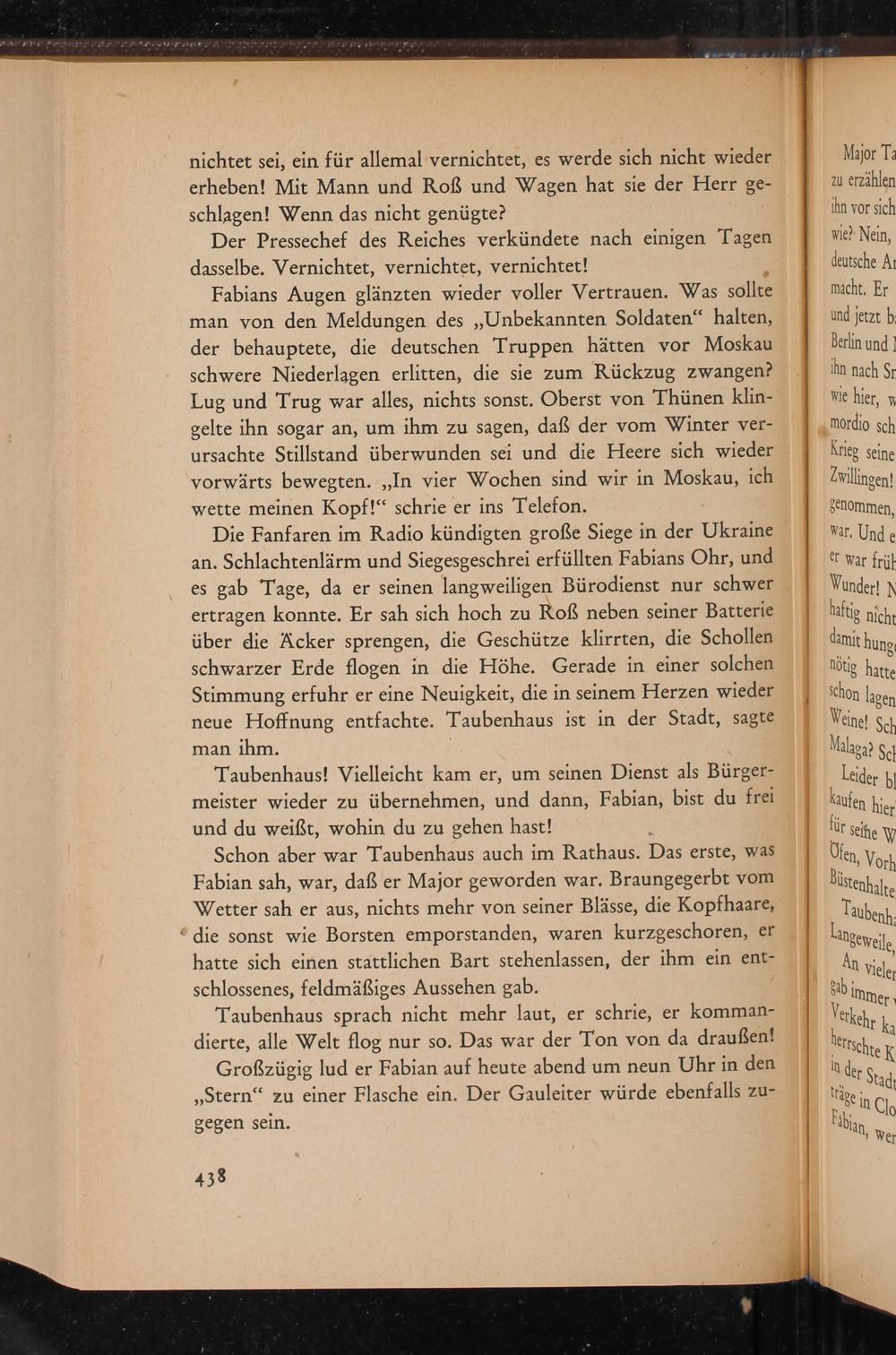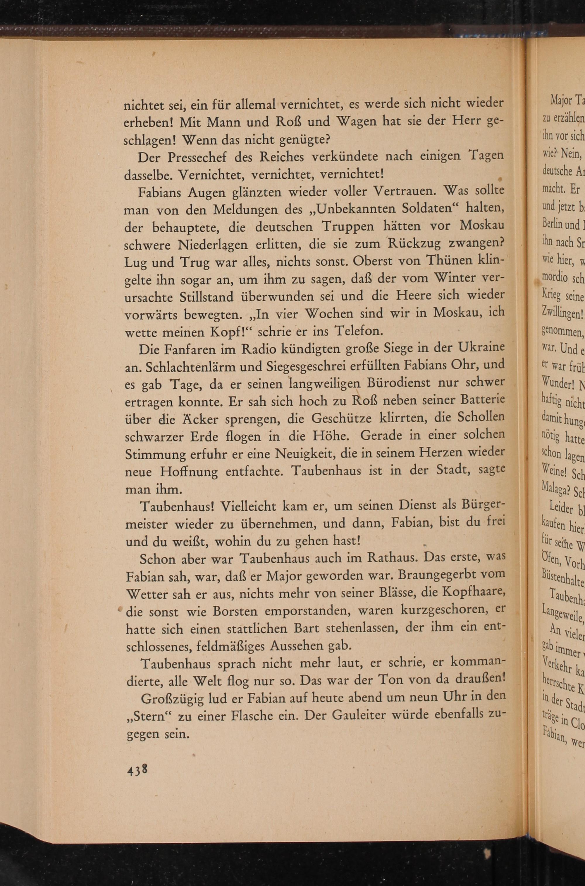 Die Fanfaren im Radio kündigten große Siege in der Ukraine an. Schlachtenlärm und Siegesgeschrei erfüllten Fabians Ohr, und es gab Tage, da er seinen langweiligen Bürodienst nur schwer ertragen konnte. Er sah sich hoch zu Roẞ neben seiner Batterie über die Acker sprengen, die Geschütze klirrten, die Schollen schwarzer Erde flogen in die Höhe. Gerade in einer solchen Stimmung erfuhr er eine Neuigkeit, die in seinem Herzen wieder neue Hoffnung entfachte. Taubenhaus ist in der Stadt, sagte man ihm.