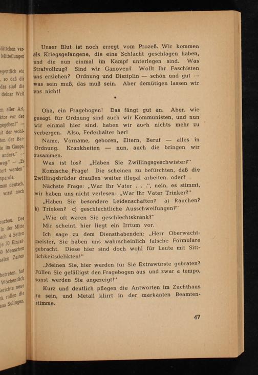 Unser Blut ist noch erregt vom Prozeß. Wir kommen als Kriegsgefangene, die eine Schlacht geschlagen haben, und die nun einmal im Kampf unterlegen sind. Was Strafvollzug? Sind wir Ganoven? Wollt Ihr Faschisten uns erziehen? Ordnung und Disziplin schön und gut was sein muß, das muß sein. Aber demütigen lassen wir uns nicht!