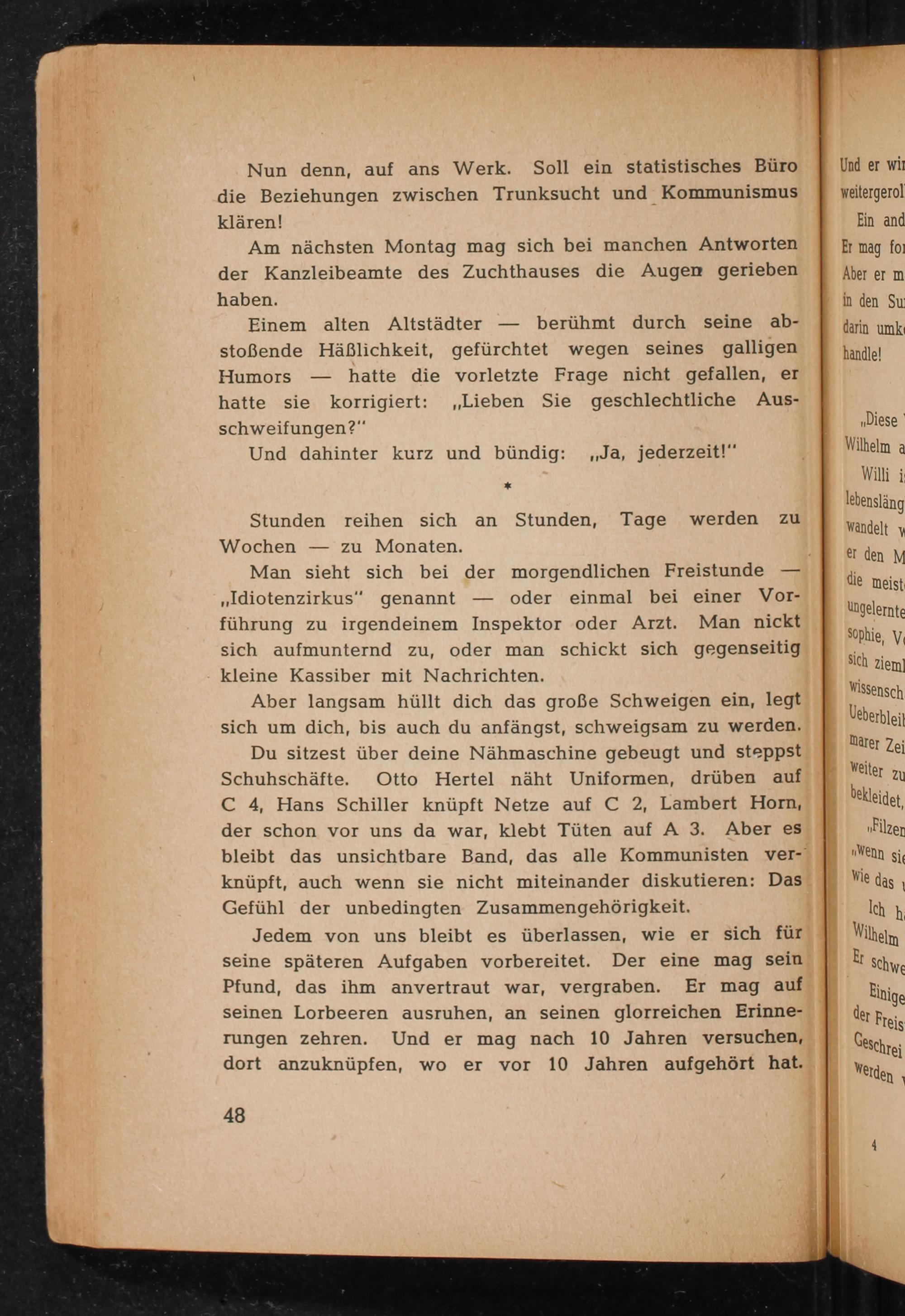 Aber langsam hüllt dich das große Schweigen ein, legt sich um dich, bis auch du anfängst, schweigsam zu werden. Du sitzest über deine Nähmaschine gebeugt und steppst Schuhschäfte. Otto Hertel näht Uniformen, drüben auf C 4, Hans Schiller knüpft Netze auf C 2, Lambert Horn , der schon vor uns da war, klebt Tüten auf A 3. Aber es bleibt das unsichtbare Band, das alle Kommunisten verknüpft, auch wenn sie nicht miteinander diskutieren: Das Gefühl der unbedingten Zusammengehörigkeit.