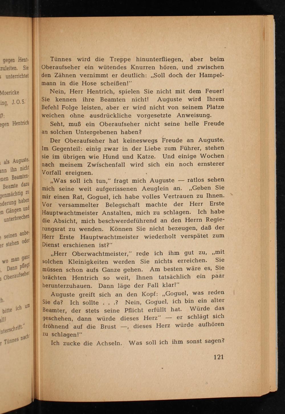 ,, Herr Oberwachtmeister," rede ich ihm gut zu ,,, mit solchen Kleinigkeiten werden Sie nichts erreichen. müssen schon aufs Ganze gehen. Am besten wäre es, Sie brächten Hentrich so weit, Ihnen tatsächlich ein paar herunterzuhauen. Dann läge der Fall klar!"