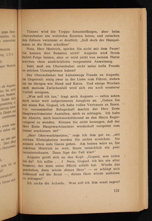 Der Oberaufseher hat keineswegs Freude an Auguste. Im Gegenteil: einig zwar in der Liebe zum Führer, stehen sie im übrigen wie Hund und Katze. Und einige Wochen nach meinem Zwischenfall wird sich ein noch ernsterer Vorfall ereignen.