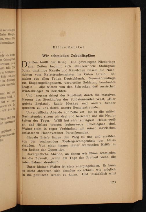 Unvergeßliche Abende auf Zelle 73! Bis in die späten Nachtstunden sitzen wir drei und berichten uns die Neuigkeiten des Tages. Willi hat sich korrigiert: Heute weiß er, daß Hitlers Armeen keineswegs unbesiegbar sind. Walter steht in reger Verbindung mit seinen inzwischen entlassenen Hannoveraner Parteifreunden.