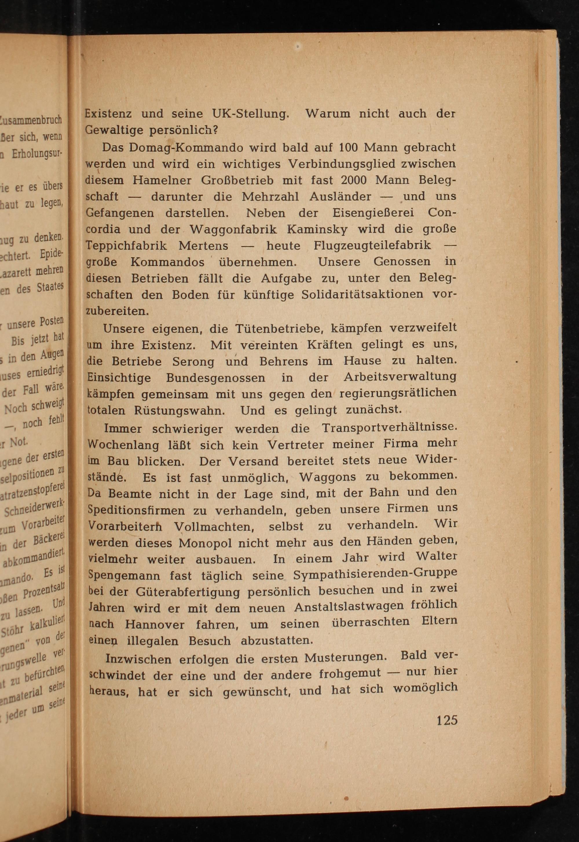 Immer schwieriger werden die Transportverhältnisse. Wochenlang läßt sich kein Vertreter meiner Firma mehr im Bau blicken. Der Versand bereitet stets neue Widerstände. Es ist fast unmöglich, Waggons zu bekommen. Da Beamte nicht in der Lage sind, mit der Bahn und den Speditionsfirmen zu verhandeln, geben unsere Firmen uns Vorarbeiterh Vollmachten, selbst verhandeln. Wir werden dieses Monopol nicht mehr aus den Händen geben, vielmehr weiter ausbauen. In einem Jahr wird Walter Spengemann fast täglich seine Sympathisierenden- Gruppe bei der Güterabfertigung persönlich besuchen und in zwei Jahren wird er mit dem neuen Anstaltslastwagen fröhlich nach Hannover fahren, um seinen überraschten Eltern