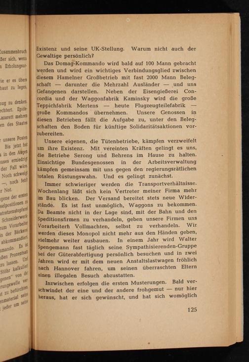 Unsere eigenen, die Tütenbetriebe, kämpfen verzweifelt um ihre Existenz. Mit vereinten Kräften gelingt es uns, die Betriebe Serong und Behrens im Hause zu halten. Einsichtige Bundesgenossen in der Arbeitsverwaltung kämpfen gemeinsam mit uns gegen den regierungsrätlichen totalen Rüstungswahn. Und es gelingt zunächst.