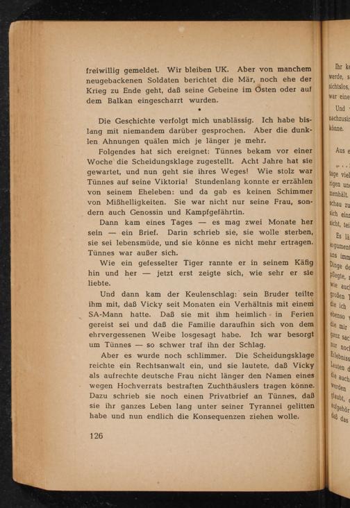 Und dann kam der Keulenschlag: sein Bruder teilte ihm mit, daß Vicky seit Monaten ein Verhältnis mit einem SA- Mann hatte. Daß sie mit ihm heimlich in Ferien gereist sei und daß die Familie daraufhin sich von dem ehrvergessenen Weibe losgesagt habe. Ich war besorgt um Tünnes so schwer traf ihn der Schlag.