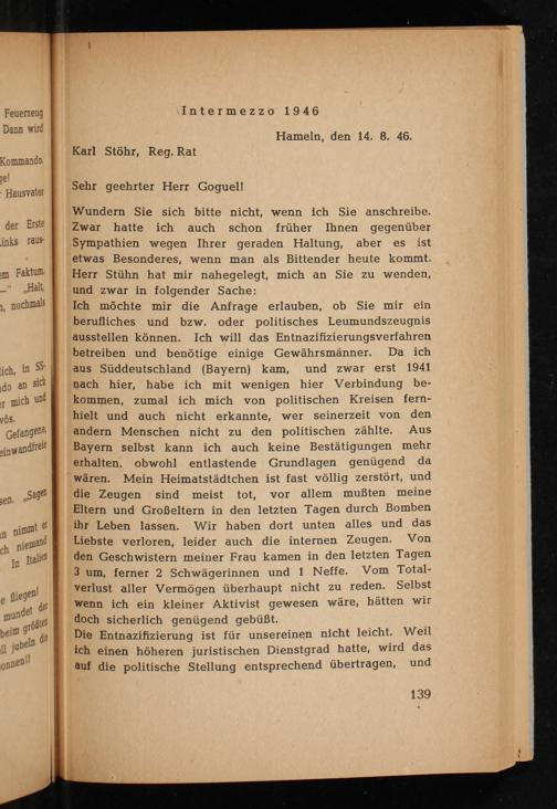 Die Entnazifizierung ist für unsereinen nicht leicht. Weil ich einen höheren juristischen Dienstgrad hatte, wird das auf die politische Stellung entsprechend übertragen, und