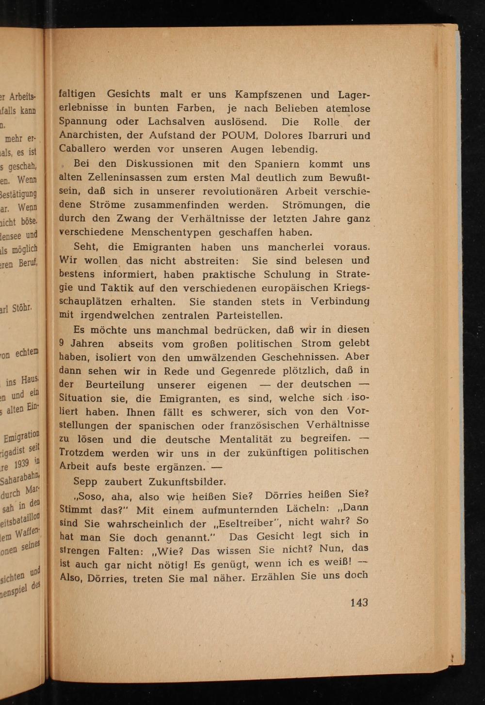 faltigen Gesichts malt er uns Kampfszenen und Lagererlebnisse in bunten Farben, je nach Belieben atemlose Spannung oder Lachsalven auslösend. Die Rolle der Anarchisten, der Aufstand der POUM, Dolores Ibarruri und Caballero werden vor unseren Augen lebendig.