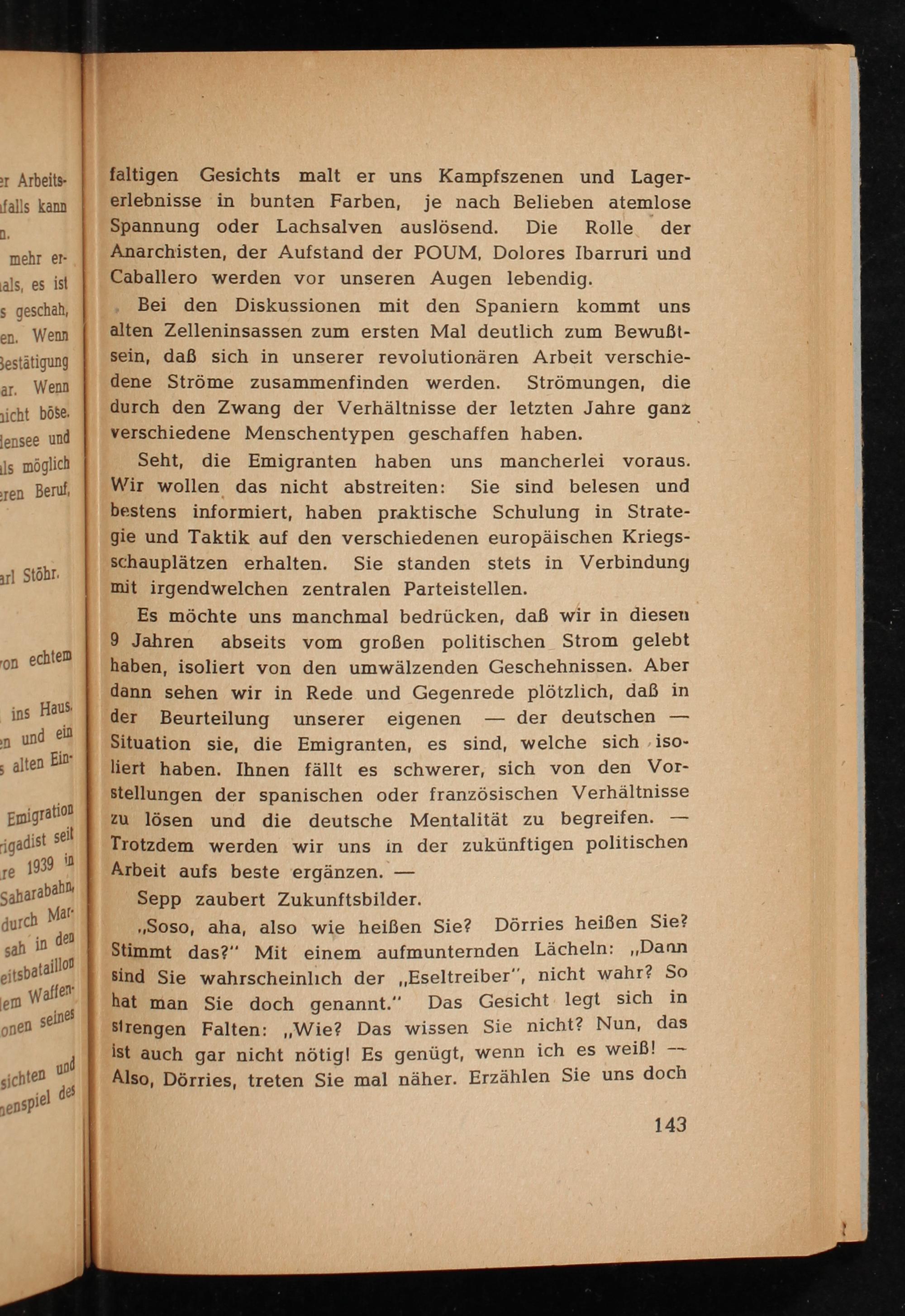 Es möchte uns manchmal bedrücken, daß wir in diesen 9 Jahren abseits vom großen politischen Strom gelebt haben, isoliert von den umwälzenden Geschehnissen. Aber dann sehen wir in Rede und Gegenrede plötzlich, daß in der Beurteilung unserer eigenen der deutschen Situation sie, die Emigranten, es sind, welche sich isoliert haben. Ihnen fällt es schwerer, sich von den Vorstellungen der spanischen oder französischen Verhältnisse zu lösen und die deutsche Mentalität zu begreifen. Trotzdem werden wir uns in der zukünftigen politischen Arbeit aufs beste ergänzen.