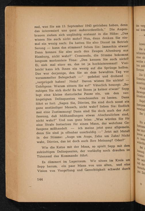 mal, was Sie am 13. September 1943 getrieben haben, denn das interessiert uns ganz außerordentlich.‘ Die Augen- brauen ziehen sich ungläubig erstaunt in die Höhe:„Das wissen Sie auch nicht mehr? Nun, dann denken Sie ein- mal ein wenig nach: Da hatten Sie also Dienst im Betrieb Serong— kann das stimmen? Sehen Sie: Immerhin etwas! Dann kennen Sie also auch den Zeugen Altenburg aus Hamburg , nicht wahr?“ Crescendo, die Stimme bekommt langsam markantere Töne:„Den kennen Sie auch nicht? Ei, sieh mal einer an, das ist ja hochinteressant! Viel- leicht kann ich Ihnen ein wenig auf die Sprünge helfen. Das war derjenige, den Sie an dem bewußten Tag vor versammelter Belegschaft—" gedehnt und drohend— „verprügelt haben! Nein? Davon wissen Sie nichts?— Uebrigens: Warum zittern Sie so?‘ Väterlich besorgt:„Be- ruhigen Sie sich doch! Es tut Ihnen ja keiner etwas!” Sepp legt eine kleine rhetorische Pause ein, um den ver- ängstigten Delinquenten verschnaufen zu lassen. Dann fährt er fort:„Sagen Sie, Dörries, Sie sind doch sonst ein ganz anständiger Mensch, nicht wahr? Sehen Sie: Endlich mal eine Zustimmung! Dann sind Sie doch auch der Auf- fassung, daß Mißhandlungen etwas Abscheuliches sind, nicht wahr?“ Und nun ganz leise:„Was würden Sie für eine Strafe festsetzen für einen Mann, der wehrlose_Ge- fangene mißhandelt— ich meine jetzt ganz allgemein, denn Sie sind ja offenbar unschuldig.— Jetzt mit Metall in der Stimme:„Auge um Auge, Zahn um Zahn! Nicht wahr, Dörries, das ist doch auch Ihre Meinung? Oder?"
