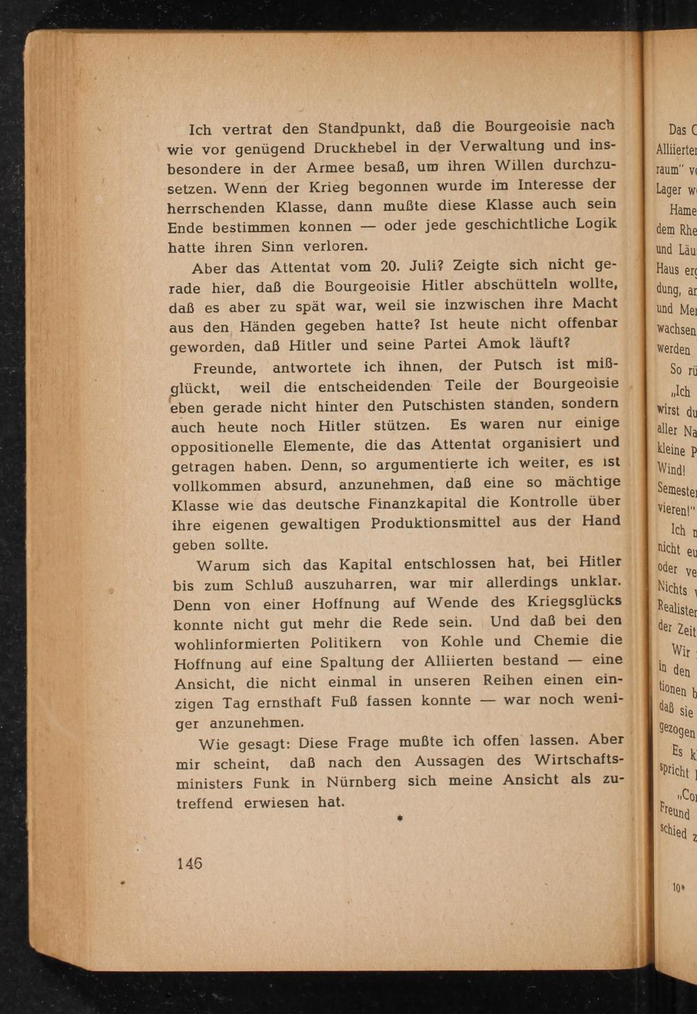 Freunde, antwortete ich ihnen, der Putsch ist miẞglückt, weil die entscheidenden Teile der Bourgeoisie eben gerade nicht hinter den Putschisten standen, sondern auch heute noch Hitler stützen. Es waren nur einige oppositionelle Elemente, die das Attentat organisiert und getragen haben. Denn, so argumentierte ich weiter, es ist vollkommen absurd, anzunehmen, daß eine so mächtige Klasse wie das deutsche Finanzkapital die Kontrolle über ihre eigenen gewaltigen Produktionsmittel aus der Hand geben sollte.