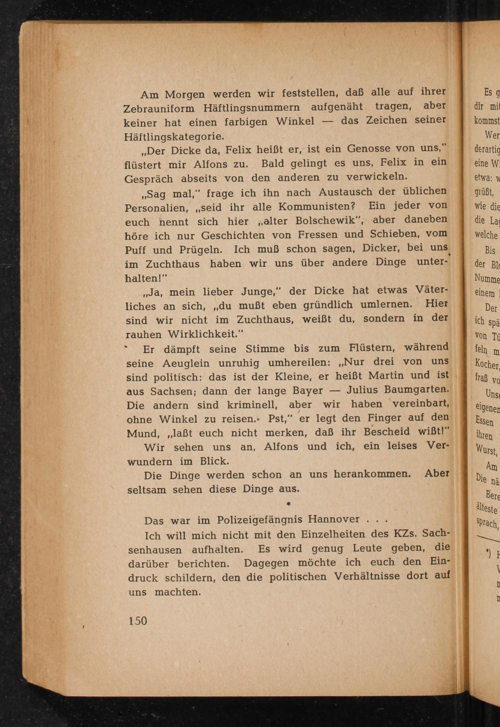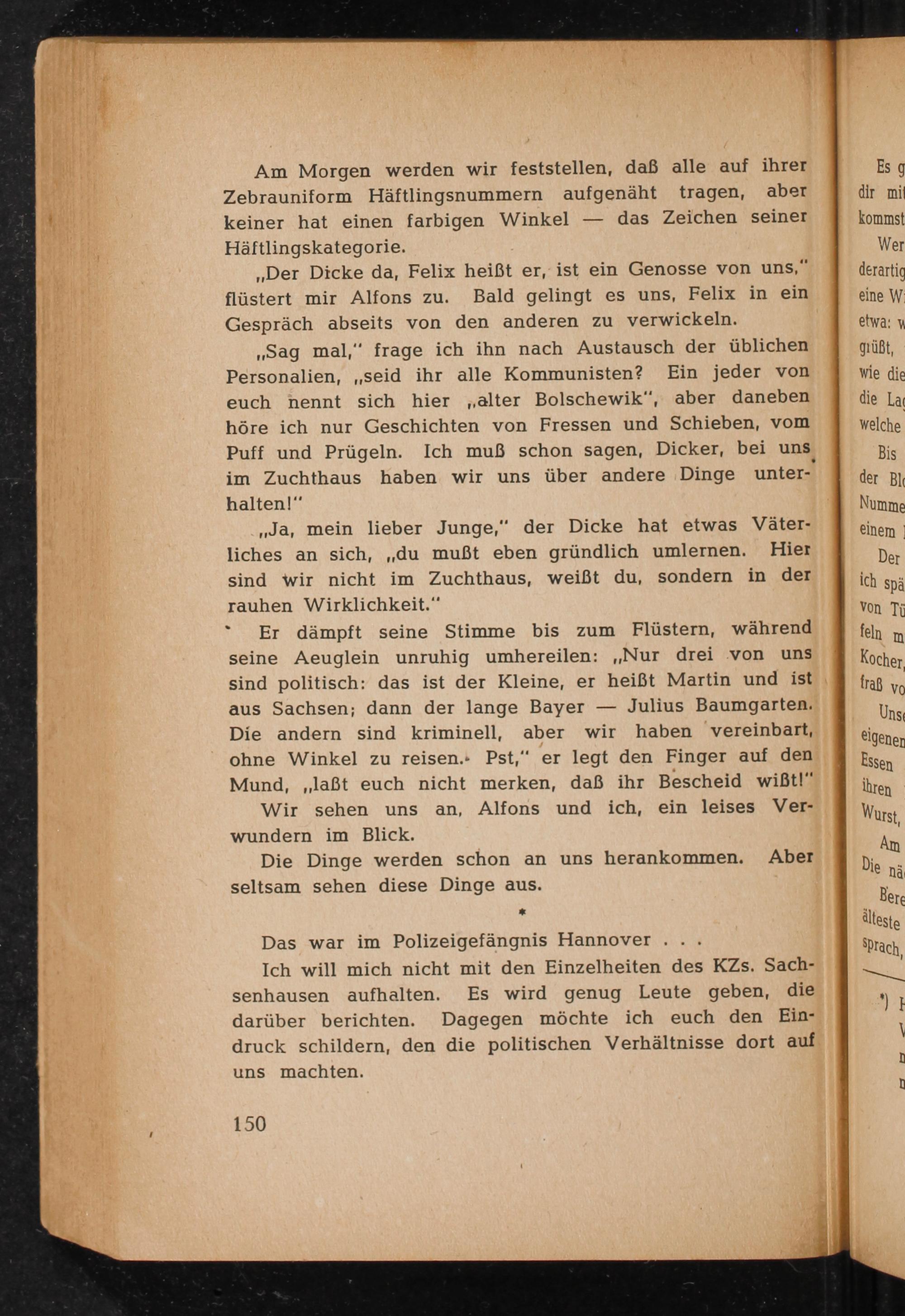 ,, Sag mal," frage ich ihn nach Austausch der üblichen Personalien ,,, seid ihr alle Kommunisten? Ein jeder von euch nennt sich hier ,, alter Bolschewik", aber daneben höre ich nur Geschichten von Fressen und Schieben, vom Puff und Prügeln. Ich muß schon sagen, Dicker, bei uns im Zuchthaus haben wir uns über andere Dinge unterhalten!"
