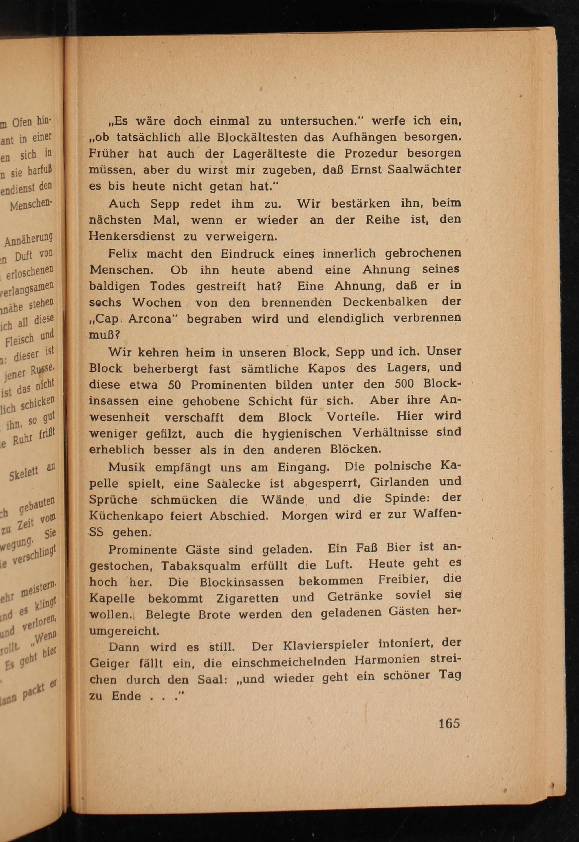 Wir kehren heim in unseren Block, Sepp und ich. Unser Block beherbergt fast sämtliche Kapos des Lagers, und diese etwa 50 Prominenten bilden unter den 500 Blockinsassen eine gehobene Schicht für sich. Aber ihre Anwesenheit verschafft dem Block Vorteile. Hier wird weniger gefilzt, auch die hygienischen Verhältnisse sind erheblich besser als in den anderen Blöcken.